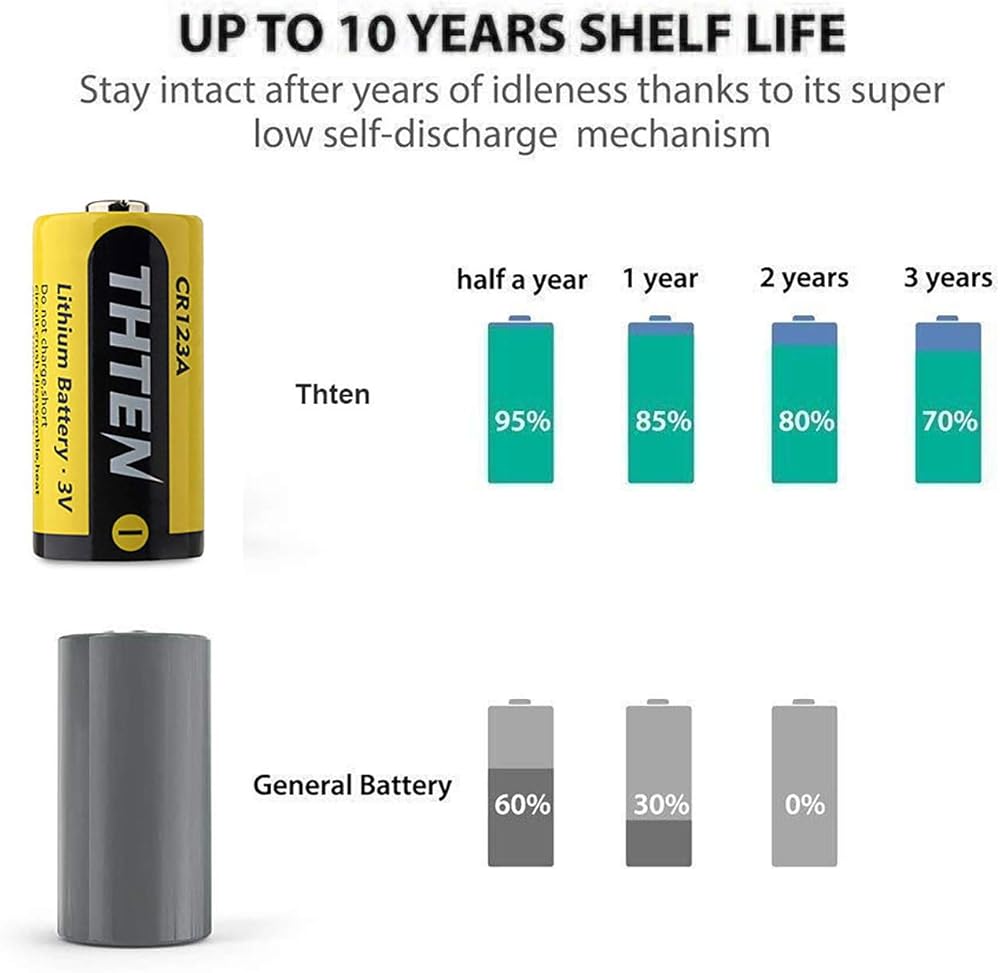 Up to 10 Year Shelf Life Survives years of idleness thanks to its outstanding power conservation capability Replace CR123 DL123A K123A EL123AP 5018LC CR17345 and CR17335 with 3V voltage Replace RCR123A RCR17335 VL123A and ML123A with 3 7V voltage