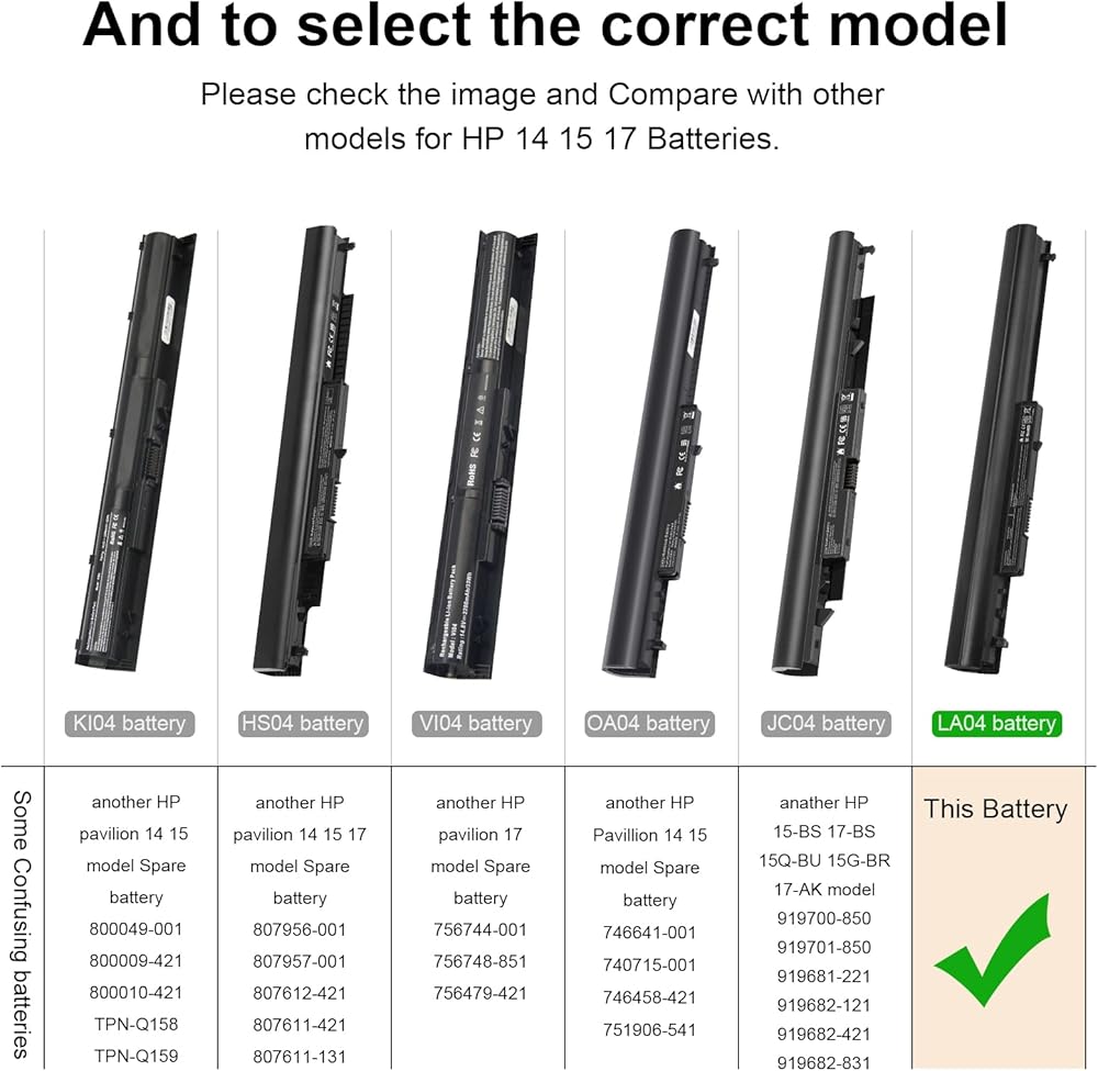 الطرز المتوافقة: تعمل بطارية الكمبيوتر المحمول هذه مع سلسلة HP Pavilion 14 15 Notebook PC، HP 248 248 G1 340 340 G1 350 350 G1 Series، 728460- 001، 752237-001، 776622-001، LA03، LA03DF، 888182064801، 88879 3070383، F3B96AA، F3B96AA#ABB، HSTNN-IB6R، HSTNN-YB5M، J1V00AA، LA04، LA04041-CL، LA04041DF-CL، LA04DF، TPN-Q129،TPN-Q132