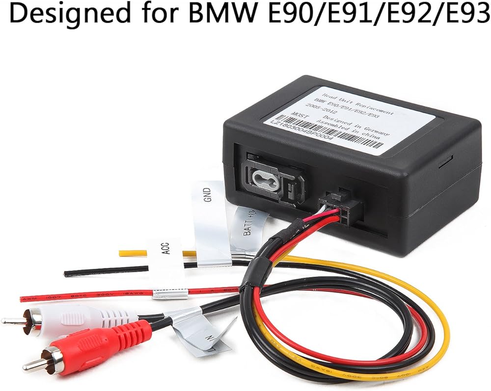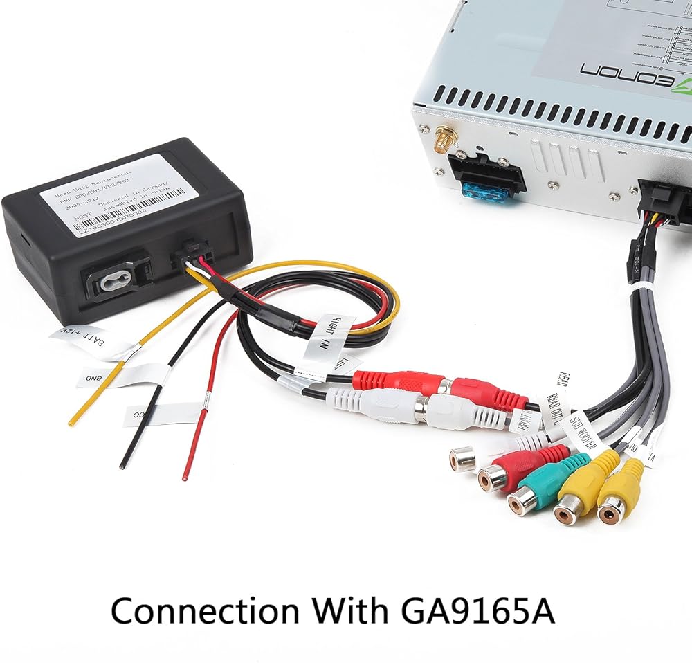 3. قم بتوصيل كيبلات فك التشفير ايه سي سي، جي ان دي، بات بنفس كابلات سيارتك. وقم بتوصيل واجهات ار سي ايه باللونين الأبيض والأحمر بواجهات إخراج الصوت لستيريو السيارة.
