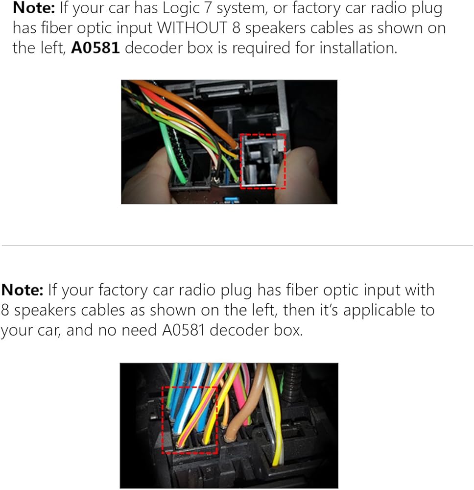 ملاحظة: إذا كانت سيارتك تحتوي على نظام لوجيك 7، أو كان قابس راديو السيارة المصنع يحتوي على مدخل من الألياف البصرية بدون 8 كابلات مكبرات صوت، فإن صندوق فك التشفير A0581 مطلوب للتركيب.