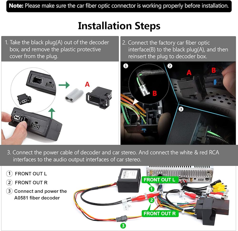 ملاحظة: يرجى التأكد من أن موصل الألياف الضوئية للسيارة يعمل بشكل صحيح قبل التركيب.