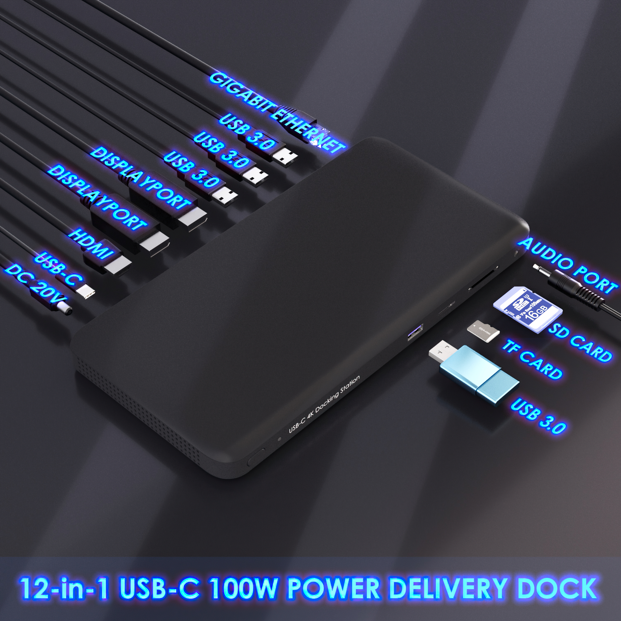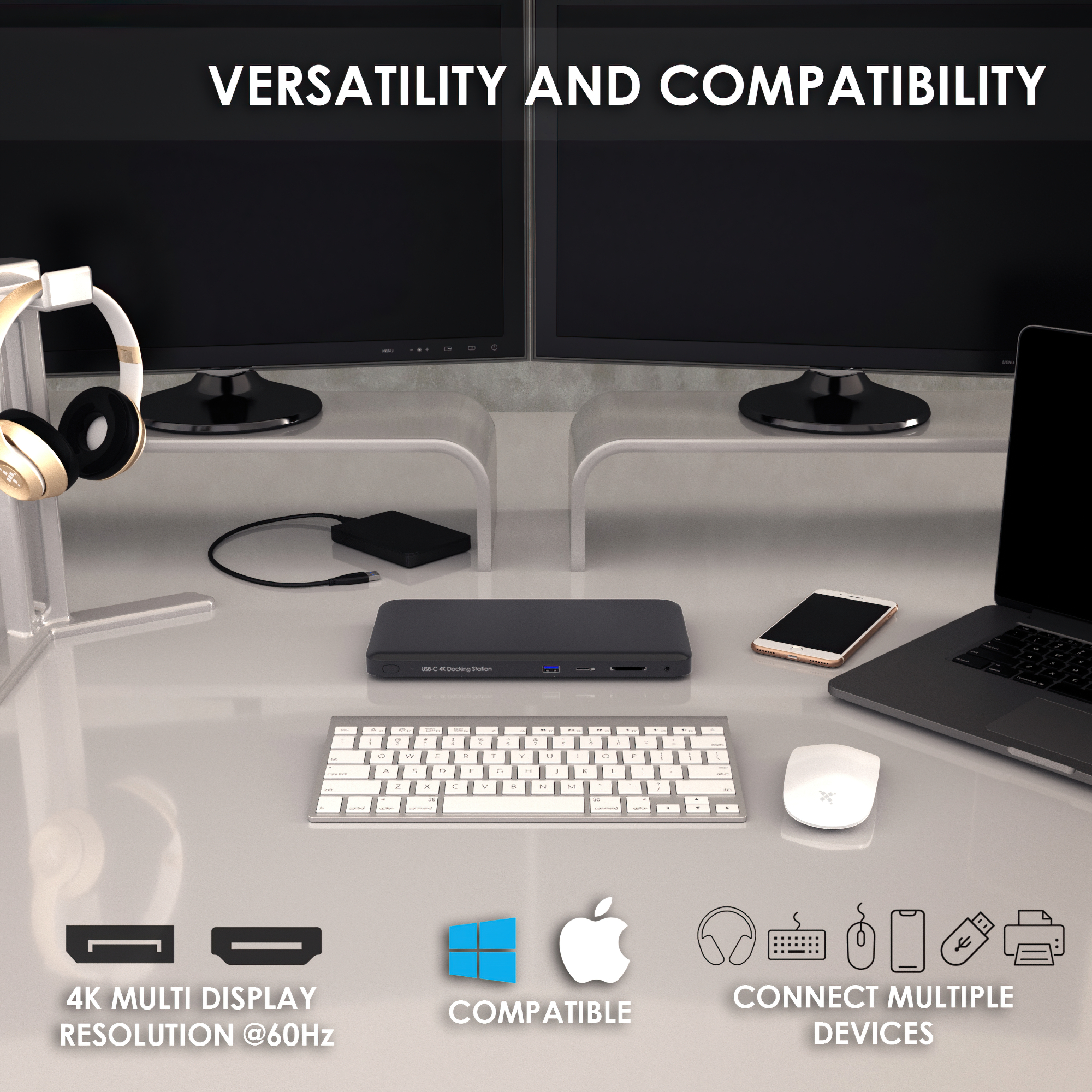 مصممة لتجارب الوسائط المتعددة الفائقة، تدعم قاعدة الشحن الخاصة بنا العرض الثلاثي مع 2x منافذ العرض و1x HDMI. سواء كنت تعمل على مهام معقدة أو ألعاب أو تبث المحتوى، استمتع بتجربة بصرية أكثر ثراءً وغامرة.