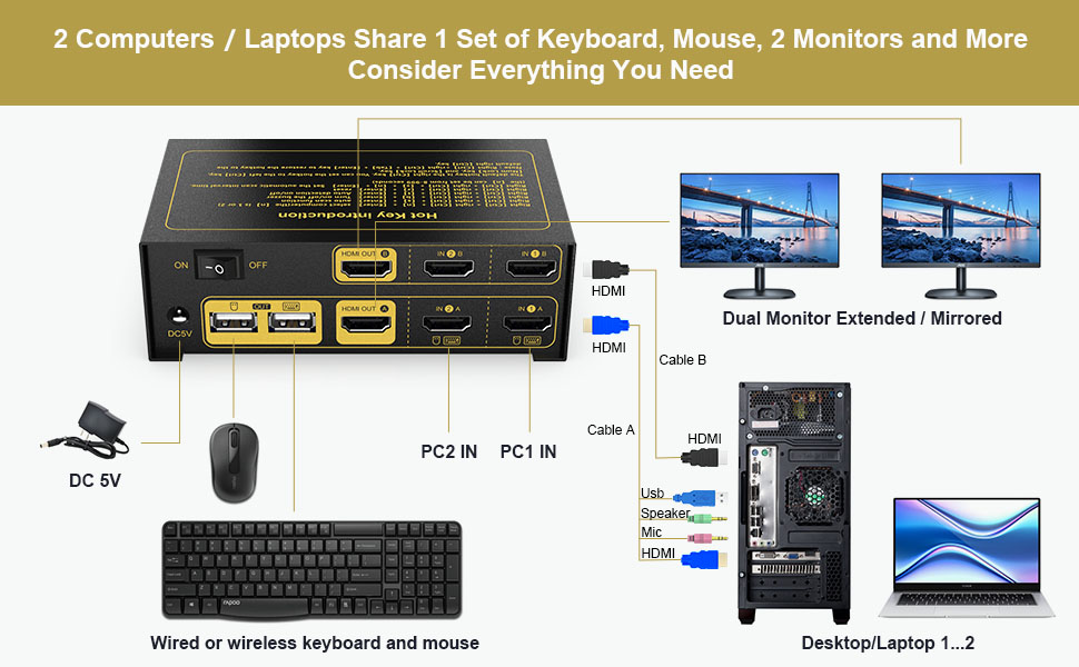 【ملاحظة】يتطلب مفتاح KVM ذو الشاشة المزدوجة أن يكون لدى كل كمبيوتر منفذي إخراج HDMI ويدعم العرض الممتد، ويدعم محول DVI/VGA/DP/USB C إلى HDMI. إذا كان جهاز الكمبيوتر الخاص بك مزودًا بمنفذ HDMI واحد فقط، فلا يمكن لهذا المنتج مساعدتك في الحصول على وظيفة العرض المزدوج.