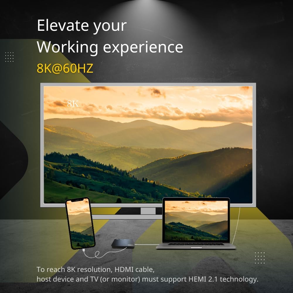 【8K 60 هرتز HDMI】يتميز بمخرج فيديو HDMI يصل إلى 8K@60 هرتز لتجربة بصرية عالية الجودة. يعد Hub4.0 حلاً متعدد الاستخدامات ومريحًا لتوسيع خيارات الاتصال لديك. بفضل تصميمه الأسود الأنيق، فإن هذا المحور ليس عمليًا فحسب، بل يضيف أيضًا لمسة من الأناقة إلى مساحة العمل الخاصة بك.