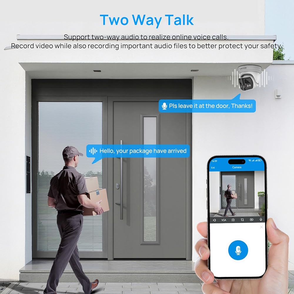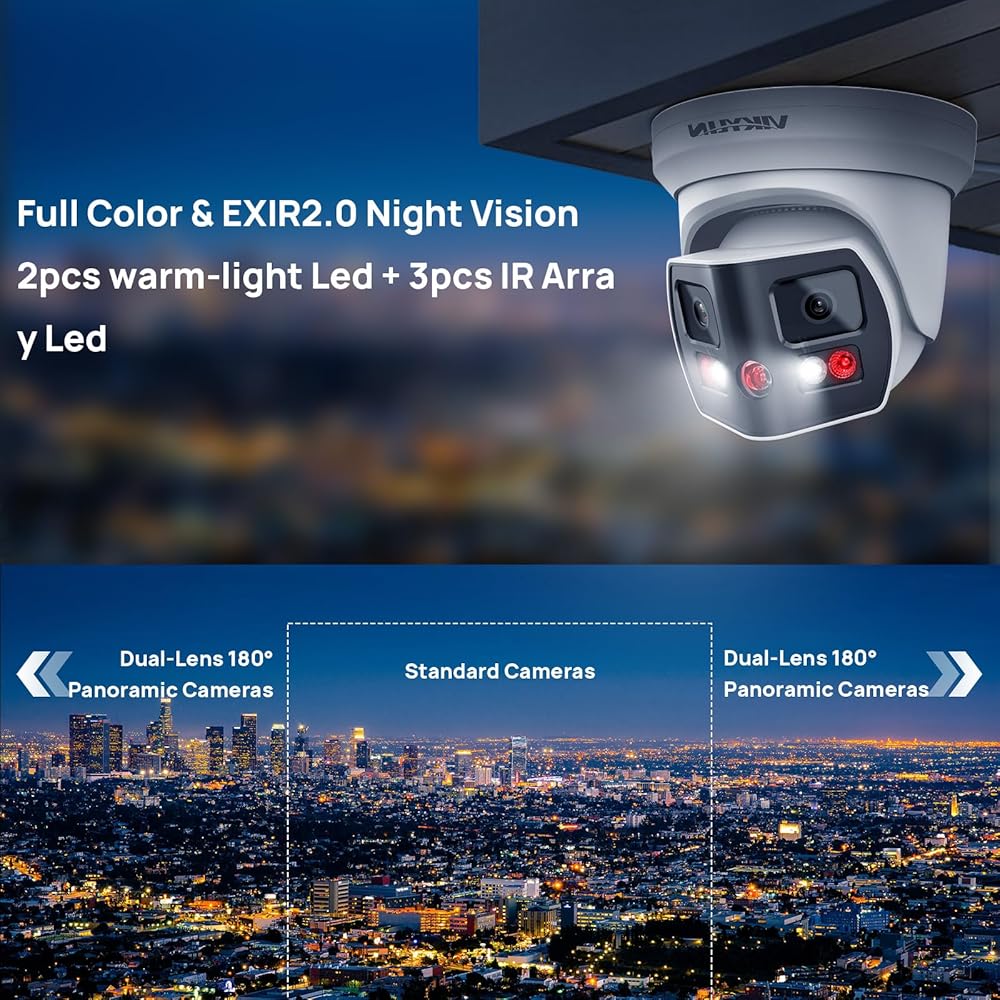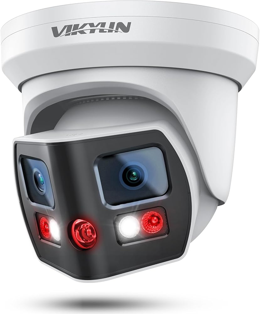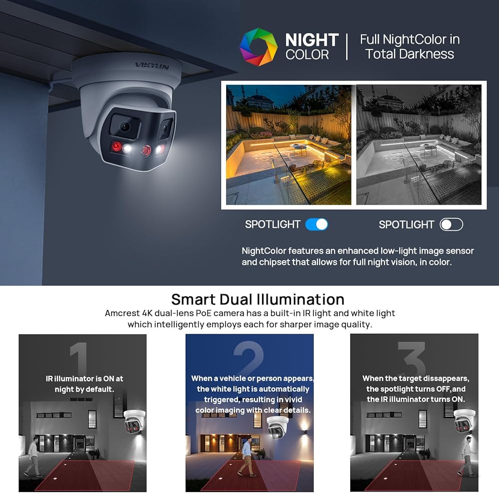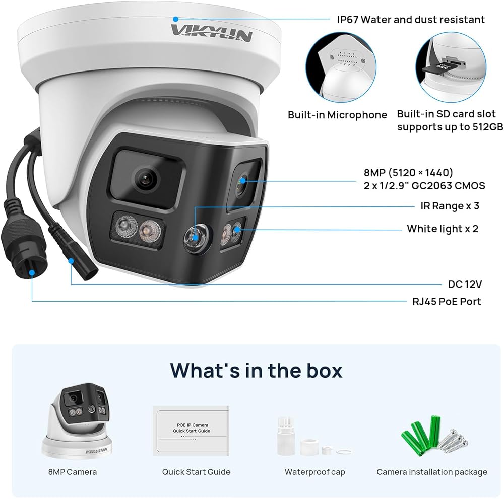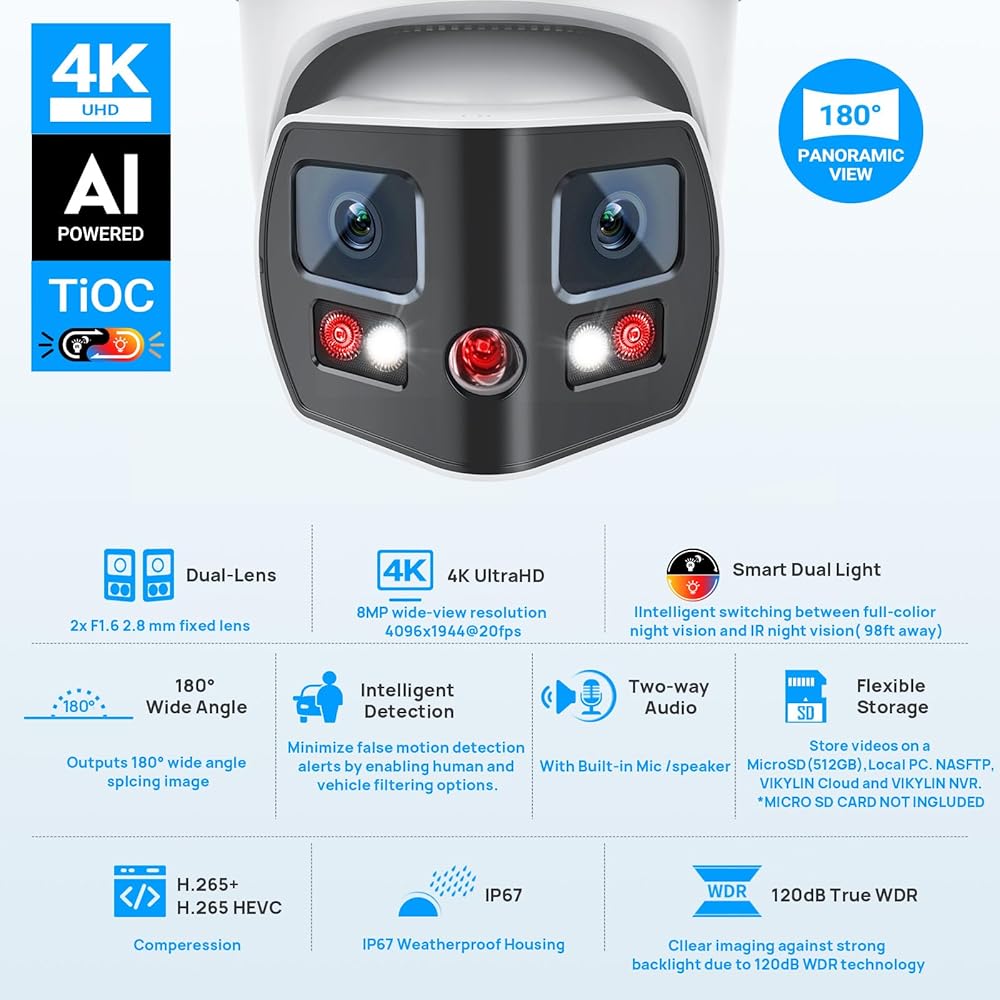 Vikylin 4K 8MP عدسة مزدوجة POE IP كاميرا أمان في الهواء الطلق مع زاوية عريضة بانورامية 180 درجة ، رؤية كاملة/exir2.0 ليلا ، الكشف عن الإنسان/المركبات ، الحديث ثنائي الاتجاه ، Micro SD (512G) ، IP67 ، Blue Iris ، NDAA متوافق