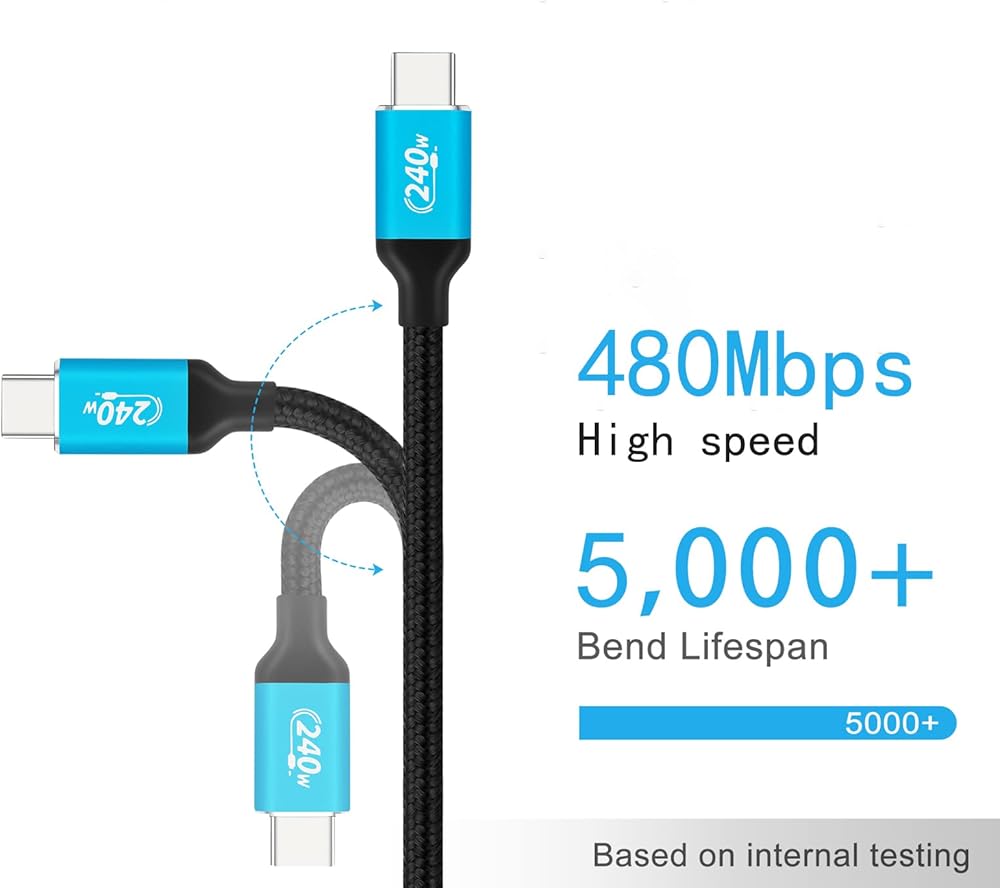 الشحن السريع: يدعم هذا الكابل ما يصل إلى 240 واط و48 فولت 5 أمبير أو 100 واط و20 فولت 5 أمبير، مما يضمن سرعات شحن فائقة السرعة. قل وداعًا للانتظار ومرحبًا بعمليات رفع الطاقة السريعة!