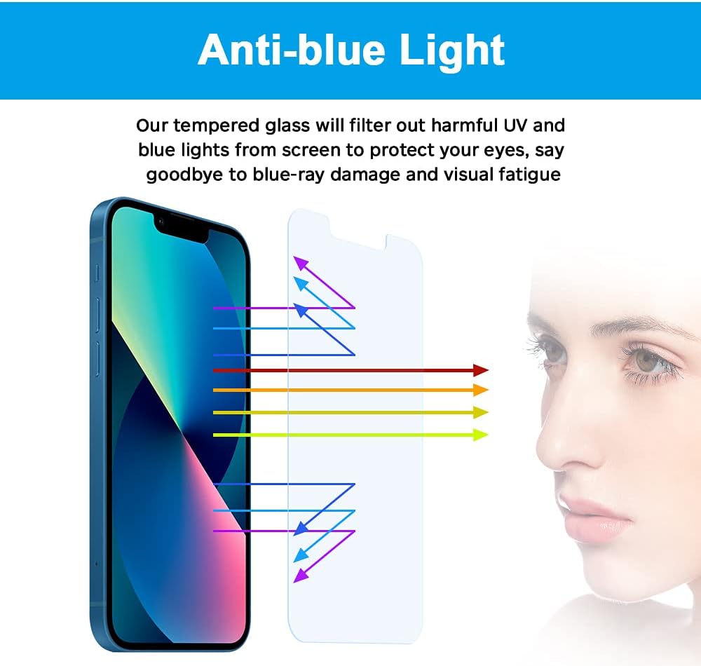 ترشيح الضوء الأزرق: يتميز بتقنية ترشيح الضوء الأزرق، مما يزيل الضوء الأزرق لشاشة هاتفك للمساعدة في تخفيف عينيك من الإجهاد والتعب. يحافظ على صحة عينيك من التحديق في الشاشة لفترات طويلة من الوقت.