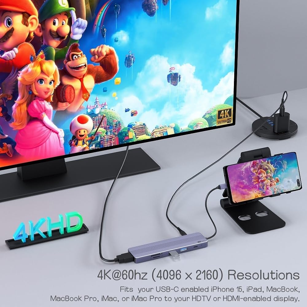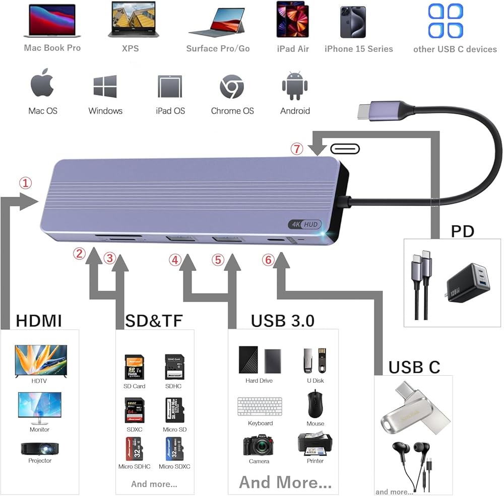موزع USB C 7 في 1 مع HDMI 4K@60HZ، وموزع USB C إلى USB مع PD 60W، وقارئ بطاقة SD/TF تصميم محول متعدد المنافذ لهاتف iPhone 15 Pro/Max/Plus، وMacBook، وiPad Pro، وiMac، والأجهزة الأخرى التي تدعم USB-C ( رمادي)