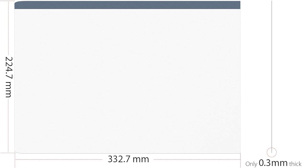 - يبلغ مقاسها 332.7 × 224.7 ملم وسمكها 0.3 ملم فقط، وتتناسب بشكل مريح حول تابلت ديكو برو ميديوم
