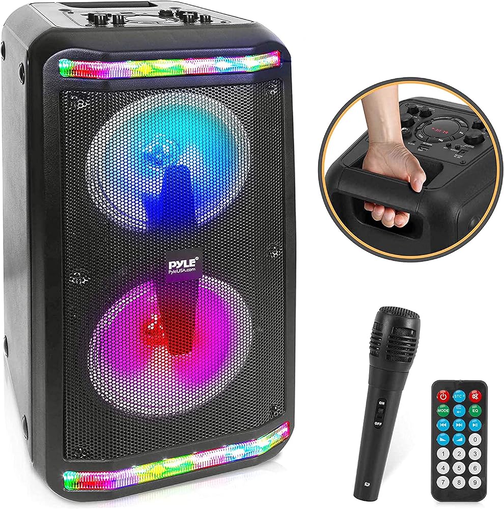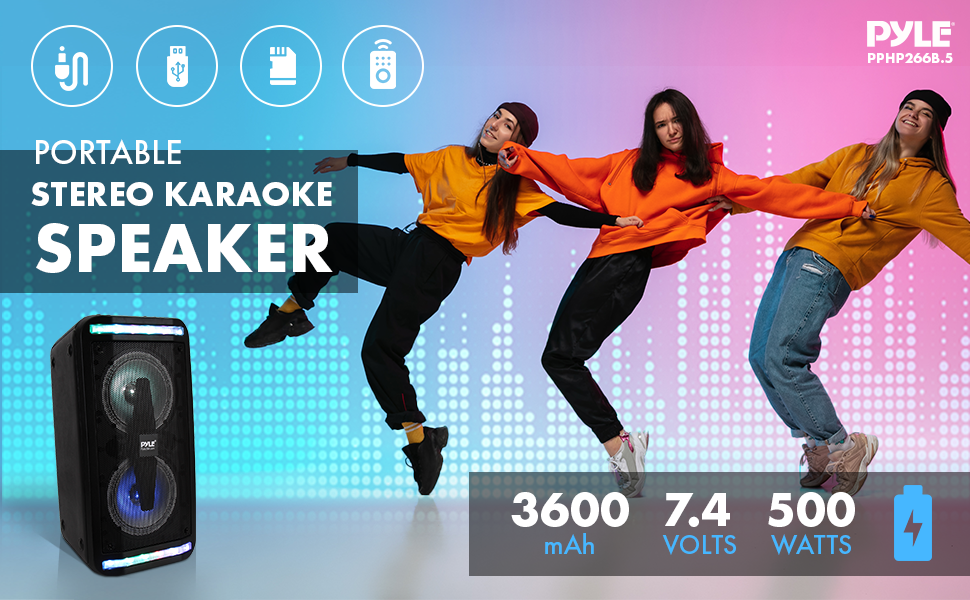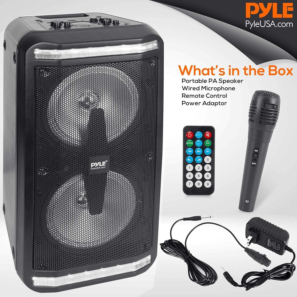 المزايا: نظام مكبر صوت PA عالي الطاقة، نمط مكبر صوت ستيريو محمول بتقنية البلوتوث، إمكانية بث الموسيقى اللاسلكية، يتضمن ميكروفون سلكي لمتعة الكاريوكي المنزلية، أضواء حفلات LED وامضة متعددة الألوان، بطارية مدمجة قابلة لإعادة الشحن، مضخم صوت مزدوج، تصميم برجي، إعادة إنتاج صوت ستيريو كامل النطاق، غلاف مضخم صوت مستدير لراديو FM باس ممتد مع شاشة LCD رقمية، مركز التحكم الصوتي بلوحة علوية، وضع تسجيل صوتي فريد، توصيل ودفق الصوت من الأجهزة الخارجية، تشغيل ملف الصوت الرقمي MP3 Aux (3. 5 مم) مقبس إدخال قارئ ذاكرة فلاش USB (2) 1/4 بوصة - بوصة (6. 5 مم) مدخلات الميكروفون/ أداة الجيتار الحجم الرئيسي، حجم الميكروفون، ثلاثة أضعاف، ضوء مؤشر مستوى البطارية القابل للتعديل، مقبض حمل متكامل مريح، تصميم خزانة مصبوبة متينة ومتينة تستخدم للتجمعات العامة، التحكم في الحشود، الكاريوكي المنزلي للداخلية / الخارجية يستخدم