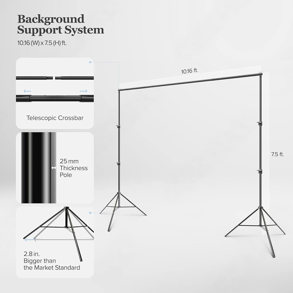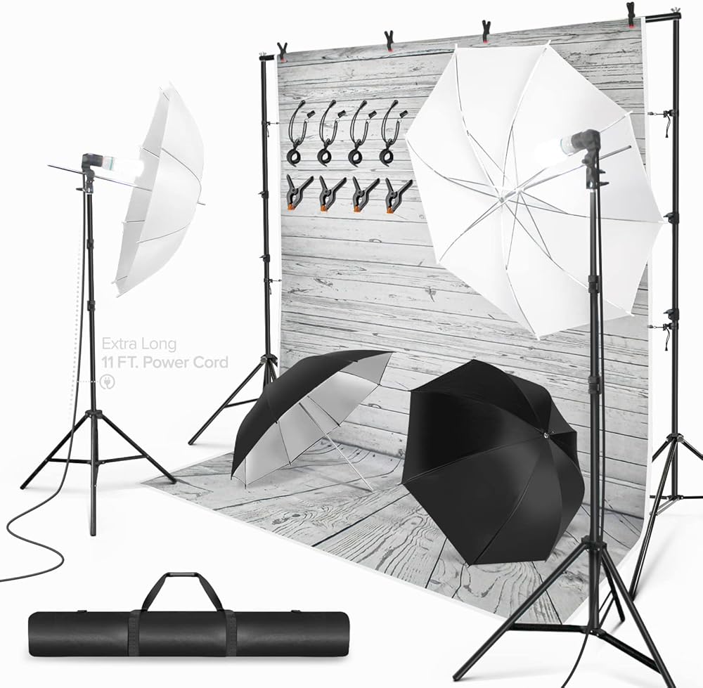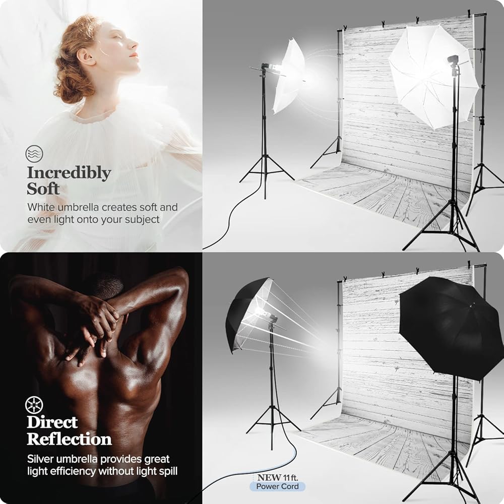 جوليوس ستوديو خلفية ارضية خشبية من الموسلين مع مجموعة اضاءة مظلة، حامل دعم الخلفية، مصباح، مقبس، مشبك زنبركي، عاكس مظلة ابيض واسود، استوديو التصوير الفوتوغرافي، JSAG355