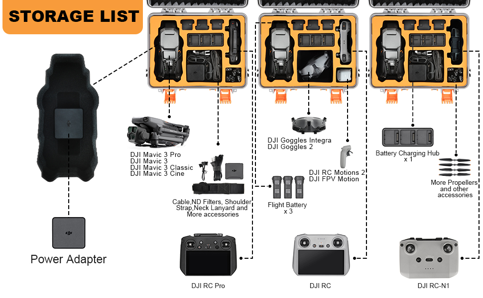 【سعة كبيرة】يمكن أن تستوعب: 1 × درون دي جيه اي مافيك 3 برو/مافيك 3 كلاسيك/سين/مافيك 3، 1 × جهاز تحكم عن بعد دي جيه اي ار سي برو/ار سي 4 بطاريات مافيك 3، 1 × دي جيه اي ار سي موشن 2 أو دي جيه اي اف بي موشن، 1 × نظارات دي جيه اي انتيجرا أو دي جيه اي 2، موزع شحن، شاحن دي جيه اي 65 واط، مراوح، مافيك 3 برو ان دي مجموعة فلاتر ومجموعة فلاتر وكابلات والمزيد ملحقات مافيك 3 برو.
