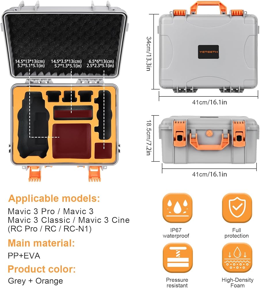 【آمنة ومتينة】حافظة مافيك 3 برو مصنوعة من مادة البولي بروبيلين الموثوقة، يمكن أن يتحمل الغلاف الخارجي تأثير 5000 باوند (وزن السيارة تقريبًا). يتم استخدام الأشرطة المطاطية المحكمة حول المفاصل الموجودة في الصندوق لضمان مستوى مقاومة الماء والغبار لحافظة مافيك 3 برو بتصنيف IP67، كما أن مقصورات فوم ايفا المخصصة تحافظ على طائرة درون دي جيه اي مافيك 3 برو منظمة أثناء السفر أو النقل.