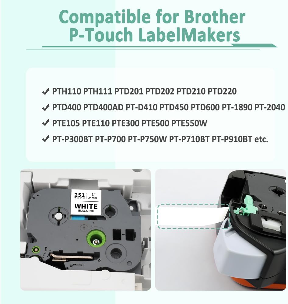 متوافق مع صانعي الملصقات Brother P touch Tze Tz 24 مم: PT-D610BT، PT-D610BTVP، PT-D600، PT-E500، PT-E550W، PT-H500، PT-P700، PT-P710BT، PT-P715eBT، PT-P750W ، PT-D800W، PT-E800W، PT-P900، PT-P900W، PT-P950NW، PT-P910BT، PT-2400، PT-2410، PT-2430PC، PT-1500PC، PT-1600، PT-1650، PT -2300، PT-2310، PT-2500PC، PT-2600، PT-2610، PT-2700، PT-2710، PT-2730، PT-7500، PT-7600، PT-3600، PT-9200DX، PT-9200PC ، PT-9500PC، PT-9600، PT-9700PC، PT-9800PCN