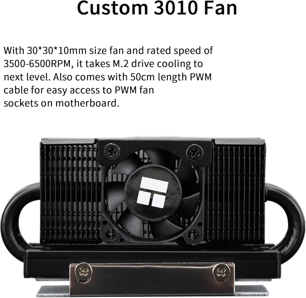 【المواصفات: حجم تبريد SSD: 90.3 مم (طول) × 23.7 مم (عرض) × 43.8 مم (ارتفاع)، المادة: الفولاذ المقاوم للصدأ + زعانف ألومنيوم، الوزن: 95 جرام، عدد أنابيب الحرارة: 4*5 مم؛ حجم المروحة: 30 × 30 × 10 مم، سرعة المروحة: 3500/6500 دورة في الدقيقة ± 10%، الجهد الكهربي: تيار مستمر 12 فولت، التيار: 0.05 أمبير، واجهة المروحة: 4PIN PWM
