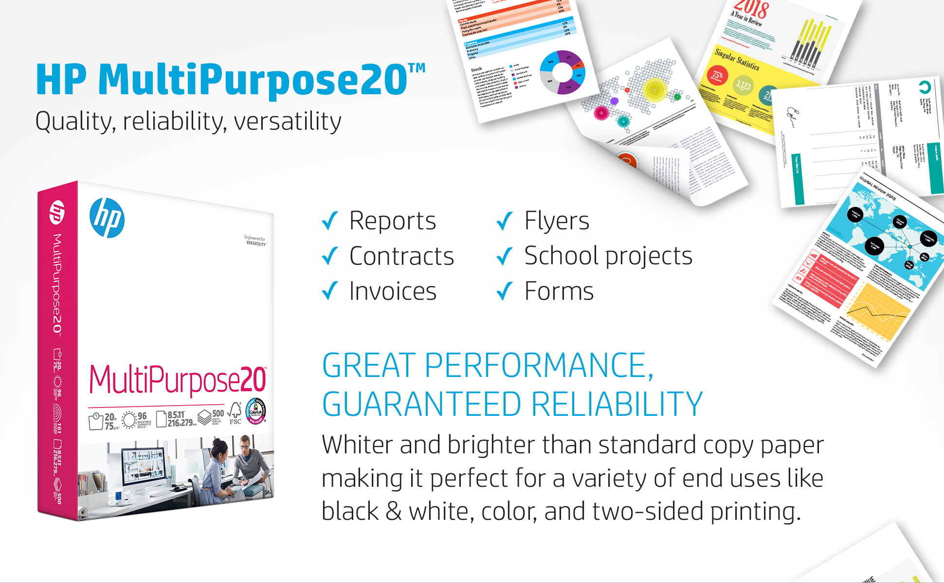 ورق مكتب مثالي متعدد الأغراض - أكثر سطوعًا من معظم أوراق الطباعة والنسخ للاستخدام اليومي، يعد MultiPurpose 20 رائعًا لجميع المستندات الداخلية، بما في ذلك الطباعة بالأبيض والأسود والطباعة الملونة اليومية.