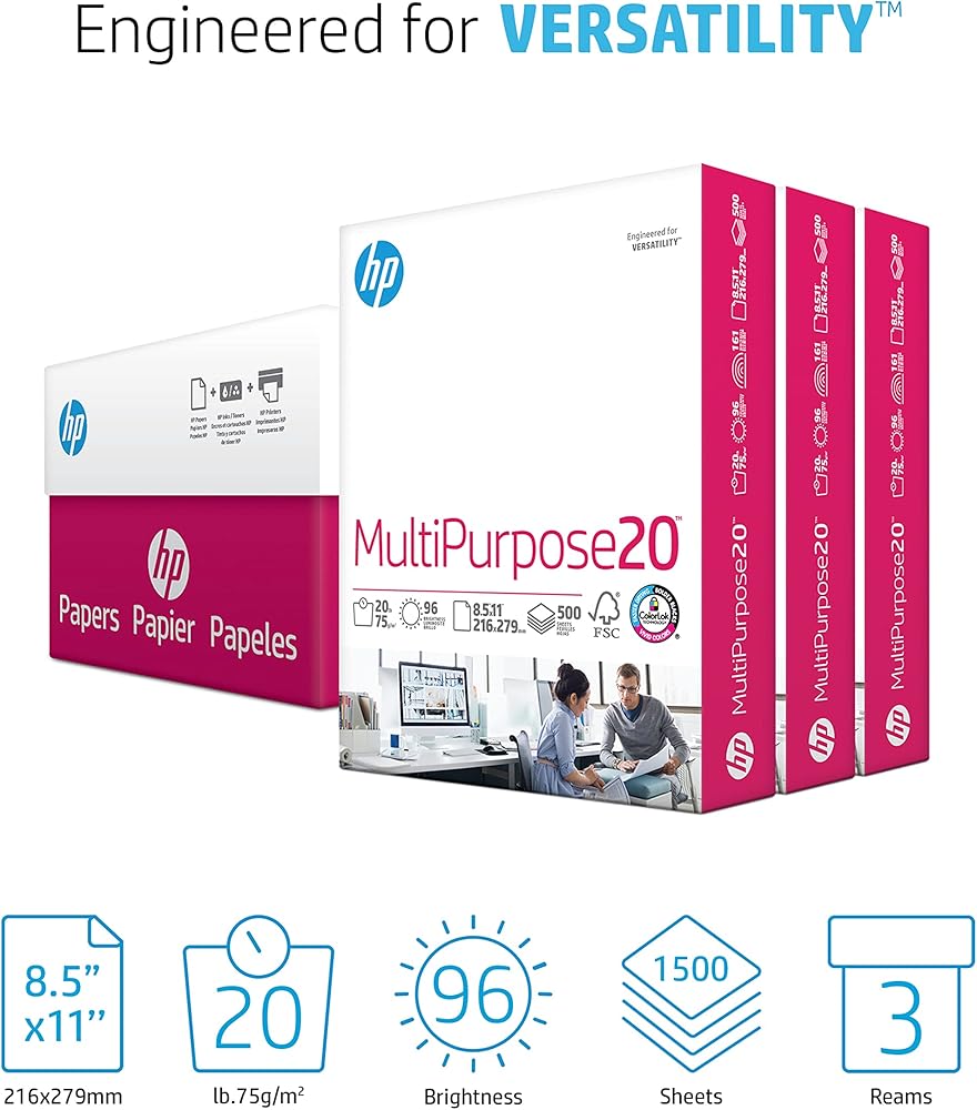 ورق طابعة HP | 8.5 × 11 ورقة | متعدد الأغراض 20 رطل | 3 علبة ريام - 1500 ورقة | 96 مشرق | صنع في الولايات المتحدة الأمريكية - معتمد من مجلس رعاية الغابات (FSC) | 112530ج