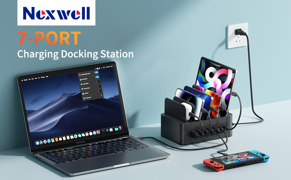 محطة شحن USB C بقدرة 100 وات لأجهزة متعددة، منظم شحن USB ذكي بـ 7 منافذ من Nexwell متوافق مع أجهزة MacBook Air وiPhone وiPad وSamsung وهواتف Android والأجهزة اللوحية