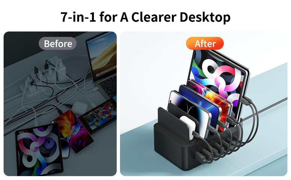 【توافق عالمي】: شاحن حائط USB C متوافق مع معظم الأجهزة التي يمكن شحنها عبر USB-C وUSB-A. يتوافق هذا الشاحن المكتبي ذو 7 منافذ مع أجهزة MacBook Pro وMacBook Air وDell XPS وسلسلة iPhone 14/13/12 وسلسلة Galaxy S22/S21 وiPad وSteam Deck والمزيد.