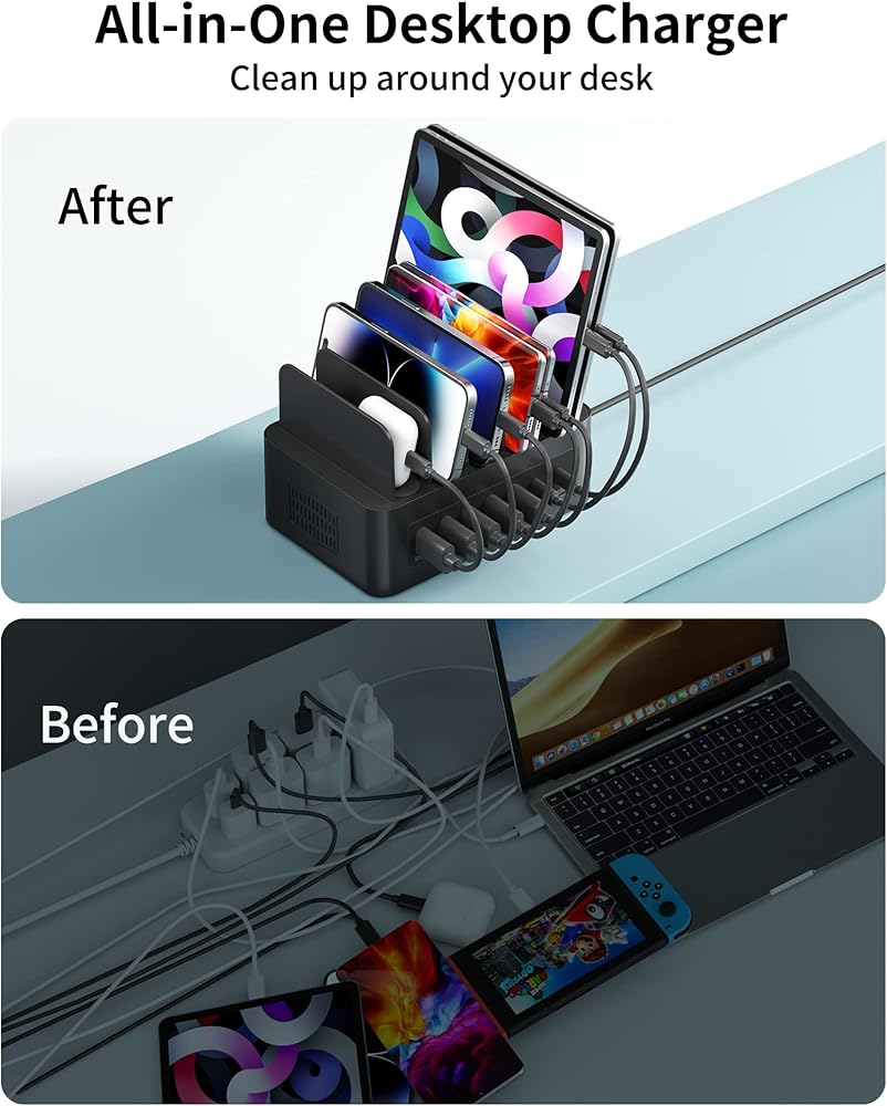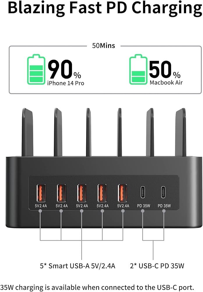 شاحن 7 في 1: مع منفذي توصيل الطاقة 2USB-C (كل منفذ 35 وات) و5 منافذ USB (كل منفذ 12 وات)، أنت جاهز لشحن سبعة من أجهزتك في وقت واحد. يكتشف تلقائيًا جميع الأجهزة المتصلة، ويضبط الإخراج وفقًا لذلك، ويضمن جهدًا ثابتًا لتقليل وقت الشحن.
