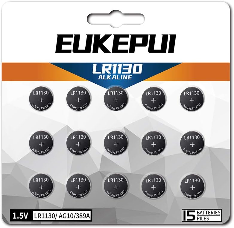 15 بطارية من طراز LR1130 معبأة على بطاقة ورقية، بمدة صلاحية تصل إلى 3 سنوات.