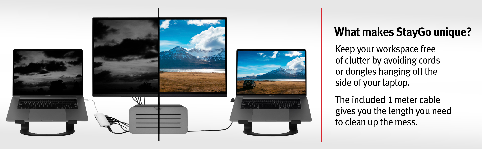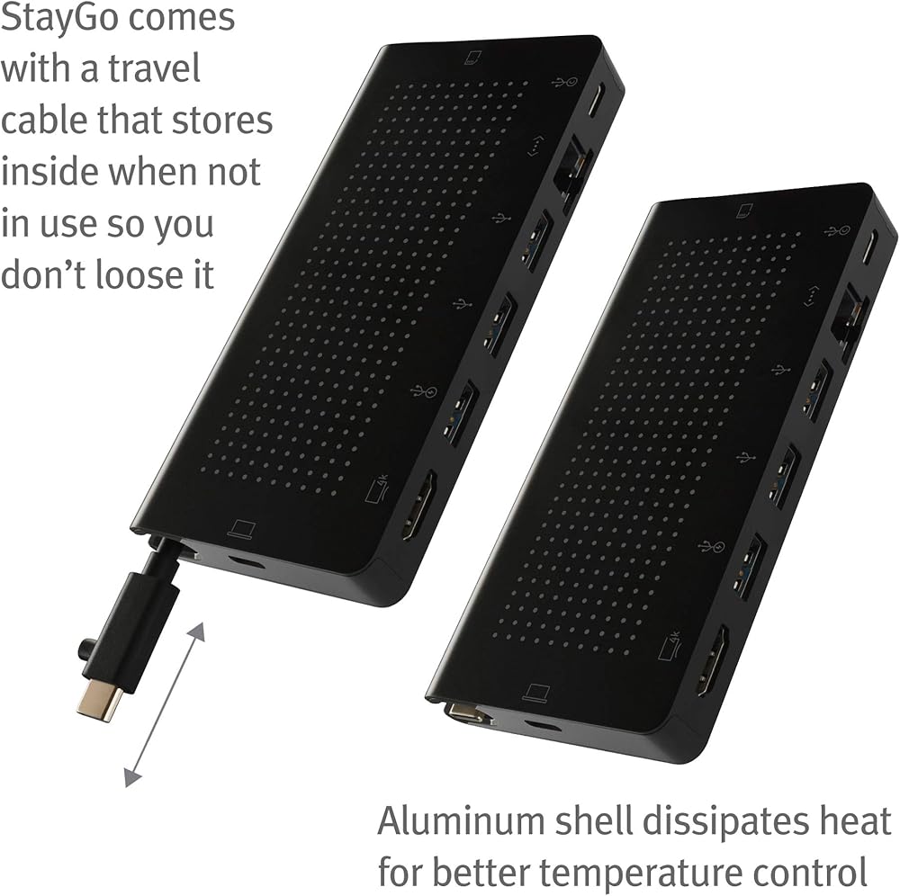 يساعد StayGo على حل مشكلة عدم وجود منافذ كافية لجهاز الكمبيوتر المحمول من النوع C أو جهاز MacBook وiMac M1 وiPad Pro. ما يجعل StayGo فريدًا من نوعه، هو حقيقة أن الكابل المتضمن الذي يبلغ طوله 1 متر يمنحك الطول اللازم لتخزين المحور بعيدًا عن الأنظار. حافظ على مساحة العمل الخاصة بك خالية من الفوضى عن طريق تجنب تعليق الأسلاك أو أجهزة الدونجل على جانب الكمبيوتر المحمول الخاص بك. قم بتوصيل محركات الأقراص الاحتياطية، وتنزيل الصور من بطاقة SD، وتوصيل شاشات HDMI الخارجية، وغير ذلك الكثير في صندوق واحد مدمج. العمل عن بعد؟ اترك السلك الذي يبلغ طوله 1 متر على مكتبك وقم بالتبديل إلى سلك السفر StayGo، والذي يتم تخزينه بشكل ملائم داخل محور الألومنيوم. الآن، أينما يأخذك العمل، يمكنك البقاء أو الذهاب بسهولة.