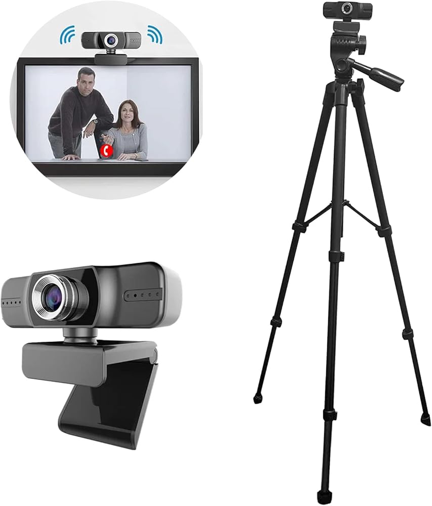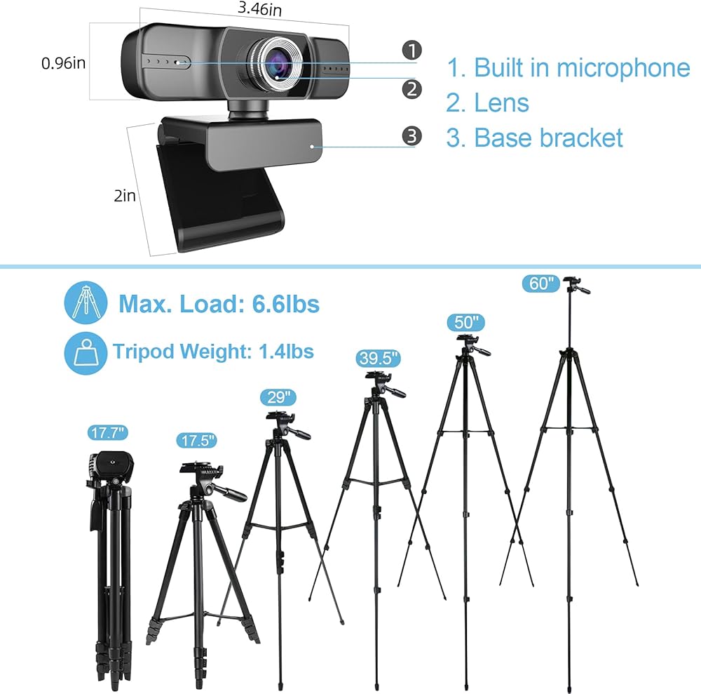 • كاميرا ويب عالية الدقة 1080 بكسل مزودة بميكروفون وكاميرا كمبيوتر شخصي للبث مع حامل ثلاثي القوائم عالي الجودة مقاس 18-60 بوصة مع حامل الهاتف المحمول