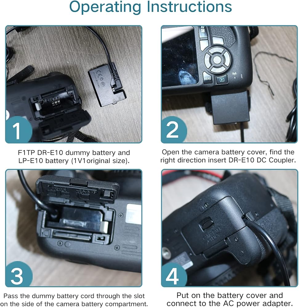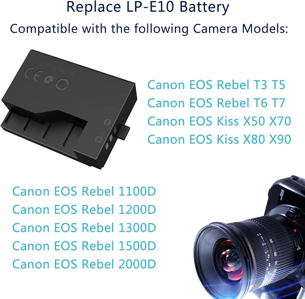 • نموذج متوافق: ACK-E10 DR-E10 طقم بطارية الدمية لكاميرات Canon EOS Rebel T3، T5، T6، T7، T100، 1100D، 1200D، 1300D، 1500D، 2000D، 3000D، 4000D، Kiss X50 X70 X80 X90.