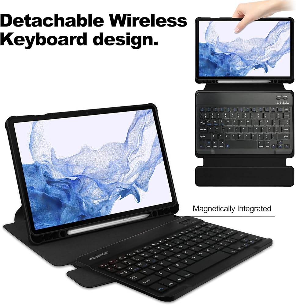 مع لوحة المفاتيح اللاسلكية القابلة لإعادة الشحن؛ لوحة المفاتيح هذه قابلة للفصل، ويمكنك خلعها من الجراب وقتما تشاء. فقط ضعه على الحافظة، ويساعد مغناطيسيًا على إبقاء لوحة المفاتيح في مكان ثابت، مما يوفر لك تجربة كتابة مريحة.