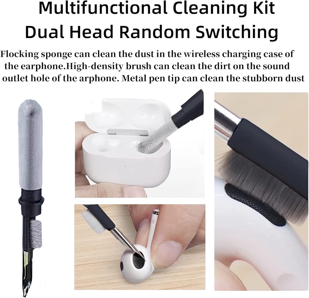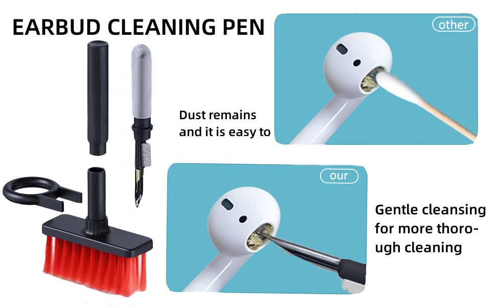 إسفنجة متدفقة وفرشاة عالية الكثافة: يمكن للإسفنجة الرقيقة والناعمة تنظيف الغبار في صندوق الشحن اللاسلكي لسماعات الأذن، ويمكن للفرشاة عالية الكثافة تنظيف الأوساخ بسهولة في فتحة الصوت والأجزاء الأخرى من سماعات الأذن، وهي مطابقة مثالية