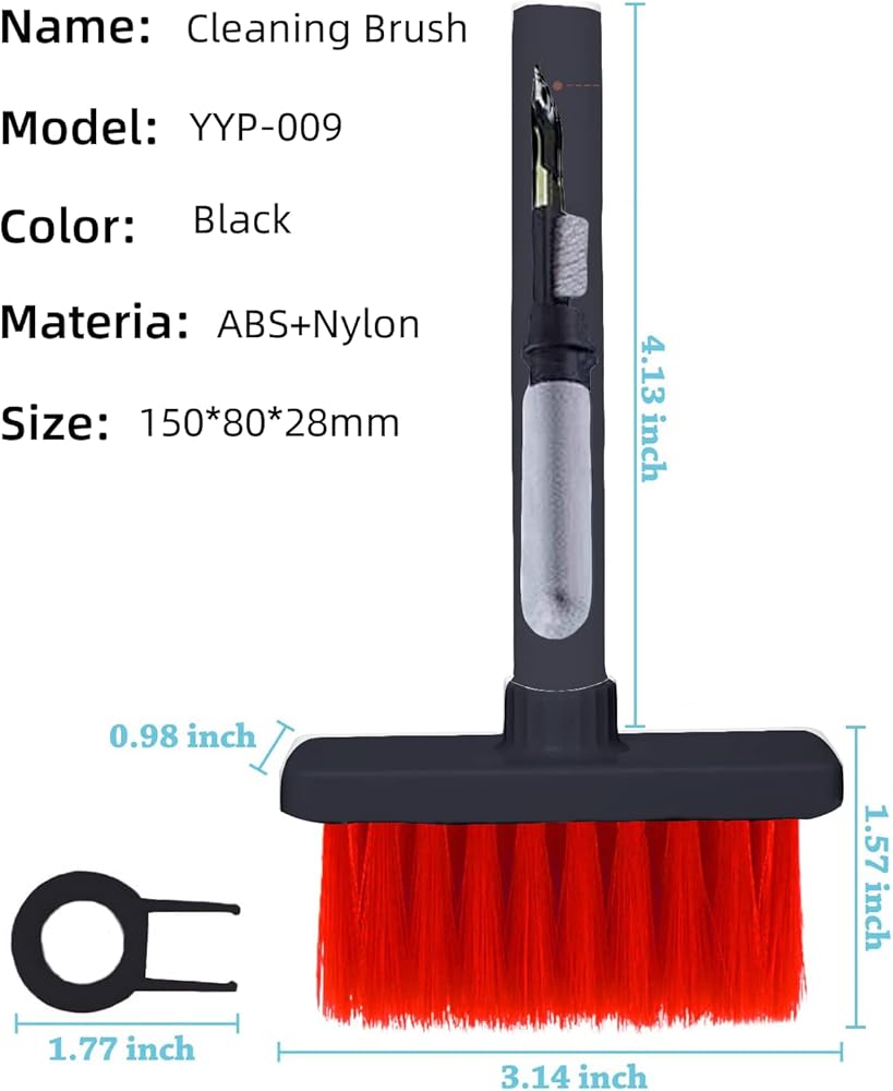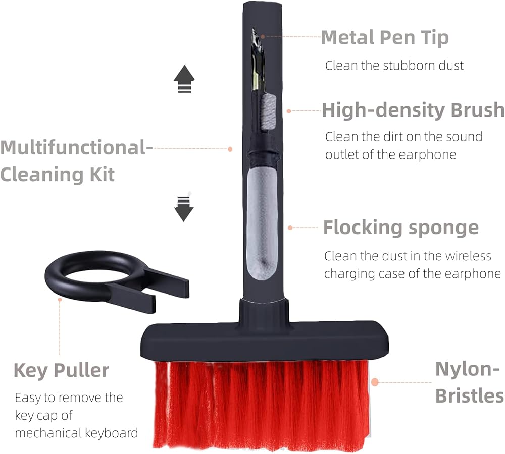 سهل الاستخدام: استخدم طرف القلم لتنظيف الغبار والحطام في صندوق سماعة الرأس البلوتوث أو فجوة سماعة الرأس، ثم استخدم الفرشاة عالية الكثافة على الجانب لمسح الحطام