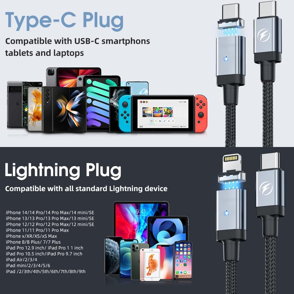 • توافق مثالي كابل شحن مغناطيسي أنكندو مزود بنوعين مختلفين من الأطراف المغناطيسية، متوافق تمامًا مع سلسلة ايفون 8 أعلاه. يدعم كيبل USB C إلى C الشحن السريع 3.0 للاب توب، سامسونج جالاكسي S22/ S22+/ S22 الترا/ S21/ S21+/ S21 الترا/ S20/ S20+/ S20 الترا/ نوت 20/ نوت 20 الترا/ نوت 10/ نوت 10+/ A80، جوجل بيكسل 2/3/4/5/5/6 ماك بوك اير 13 انش، ايباد برو 2018/2020/2021/2022، ايباد اير 2022 (الجيل الخامس)/2020 (الجيل الرابع)، ايباد الجيل العاشر، ايباد ميني والمزيد من أجهزة USB C.