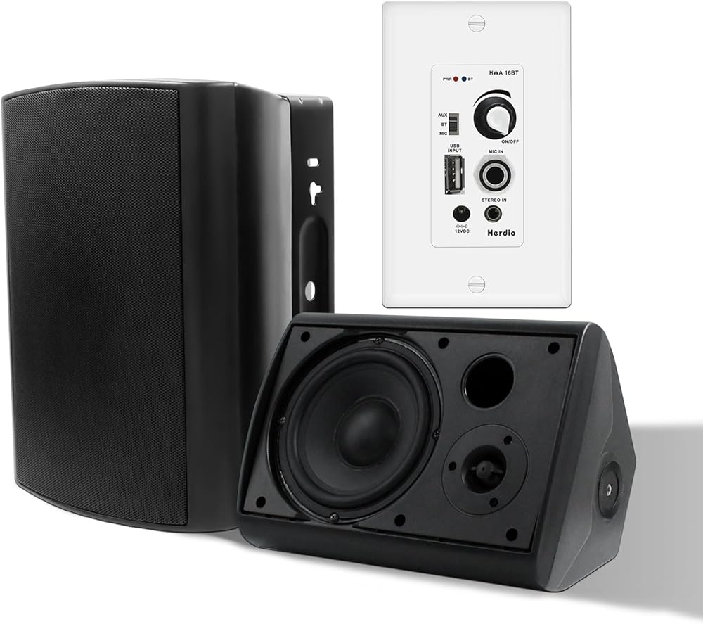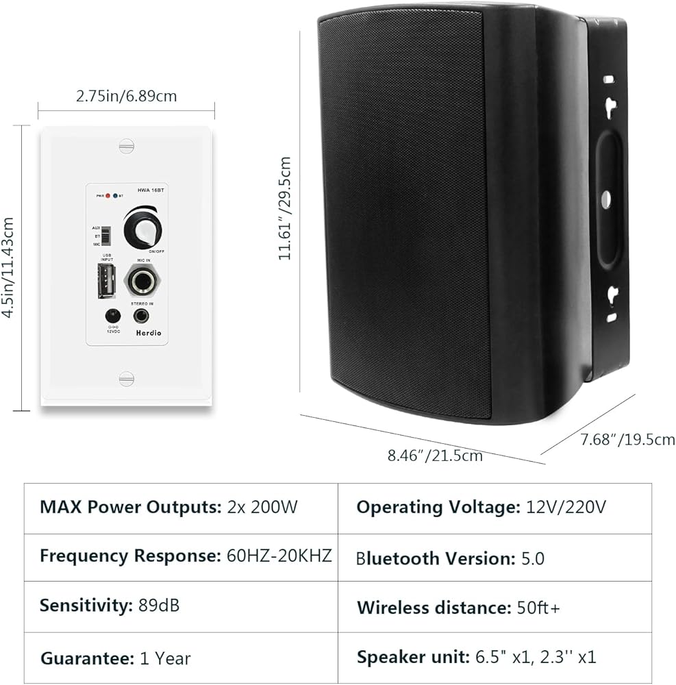 【مكبرات صوت خارجية + مضخم صوت بلوتوث على الحائط】 تتكون مجموعة مكبرات الصوت البلوتوث الخارجية من زوج من مكبرات الصوت الخارجية السلبية وجهاز استقبال مضخم الصوت ثنائي القناة. يسمح لك مكبر الصوت ببث الموسيقى إلى ميكروفون أو نظام مكبرات صوت متصل. متوافق مع جميع أحدث الأجهزة الذكية اليوم ونطاق لاسلكي يزيد عن 30 قدمًا