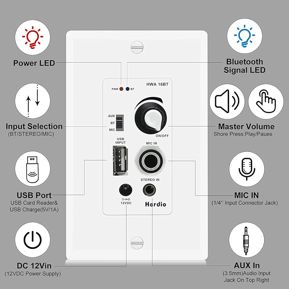 【AUX-IN / MIC IN / USB / وظيفة التحكم في مستوى الصوت 】 يتميز جهاز استقبال مضخم الصوت البلوتوث الموجود على الحائط بقارئ ذاكرة فلاش USB لتشغيل الوسائط والذي يعمل أيضًا كمنفذ شحن لأجهزتك. يتيح لك مقبس إدخال الصوت AUX مقاس 3.5 ملم توصيل الصوت من الأجهزة الخارجية وبثه، كما يضيف جهاز استقبال اللوحة الجدارية قدرة مريحة على استدعاء الميكروفون إلى جانب التحكم في الصوت بمصدر العينة
