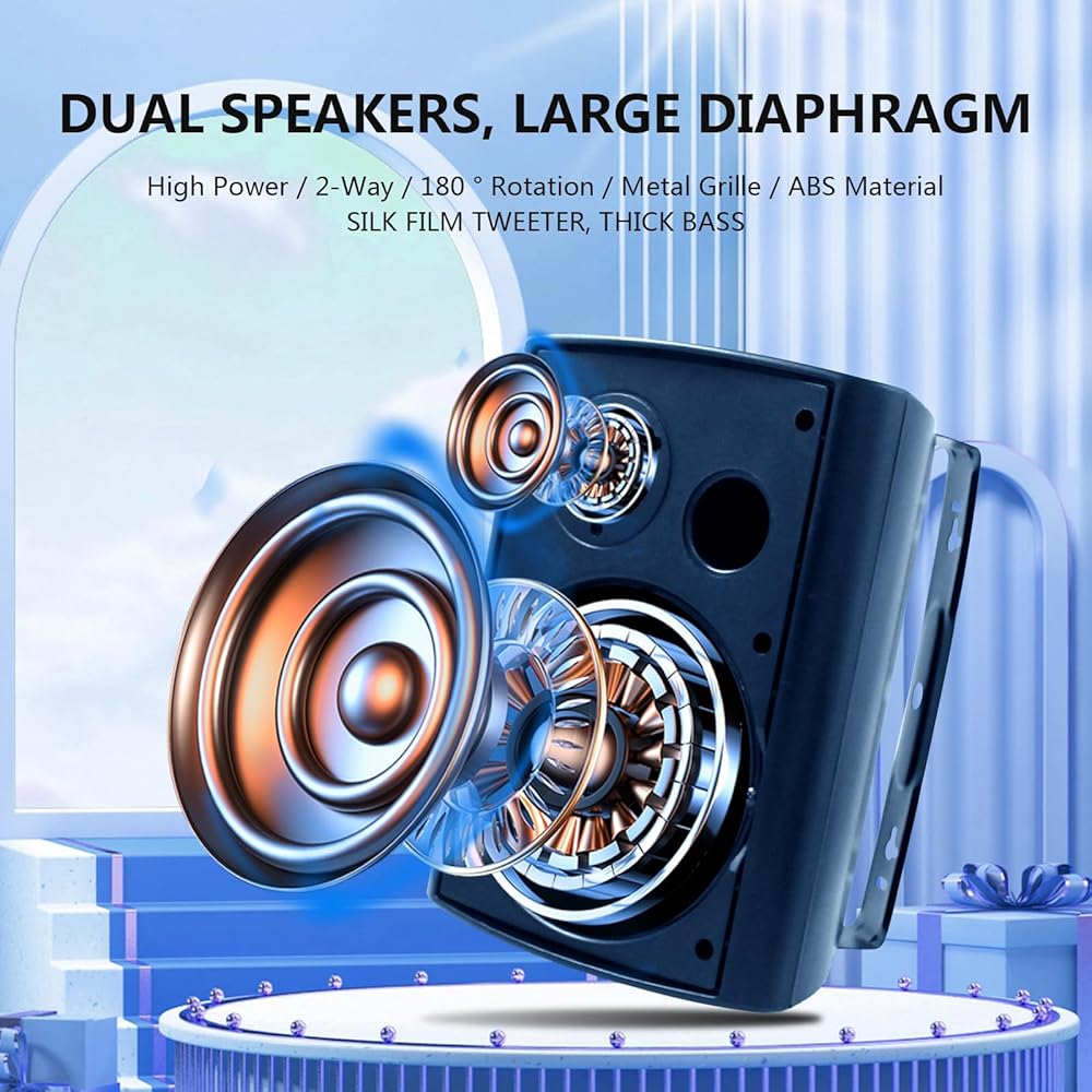 【مكبرات صوت خارجية مثبتة على الحائط مع مضخم صوت 6.5 بوصة ومكبر صوت 2.3 بوصة】 تتمتع مكبرات الصوت الخارجية المقاومة للماء بقدرة قصوى تبلغ 400 واط (200 واط لكل مكبر صوت، 200 واط*2). تشتمل السماعة الخارجية على مكبر صوت قوي مقاس 6.5 بوصة ومكبر صوت على شكل قبة مقاس 2.3 بوصة وتتميز بتصميم هندسي فريد لضمان امتلاء منطقتك بمستويات عالية نظيفة واستجابة جهير مذهلة