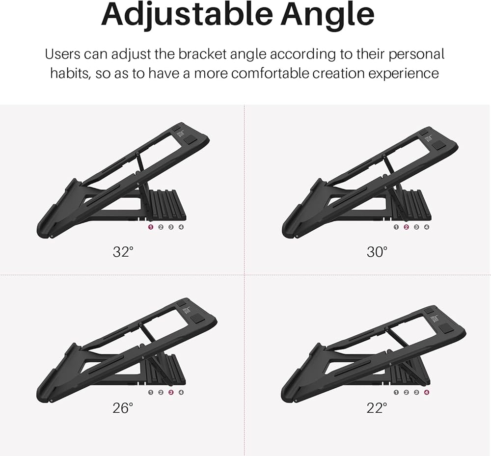 • تعديل متعدد الزوايا: يدعم الحامل القابل للطي ST053 تعديلات أربع زوايا (32 درجة، 30 درجة، 26 درجة، 22 درجة)، يمكنك تغيير الزاوية وفقًا لعاداتك الخاصة، وفتح الوضع المريح.