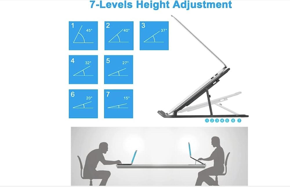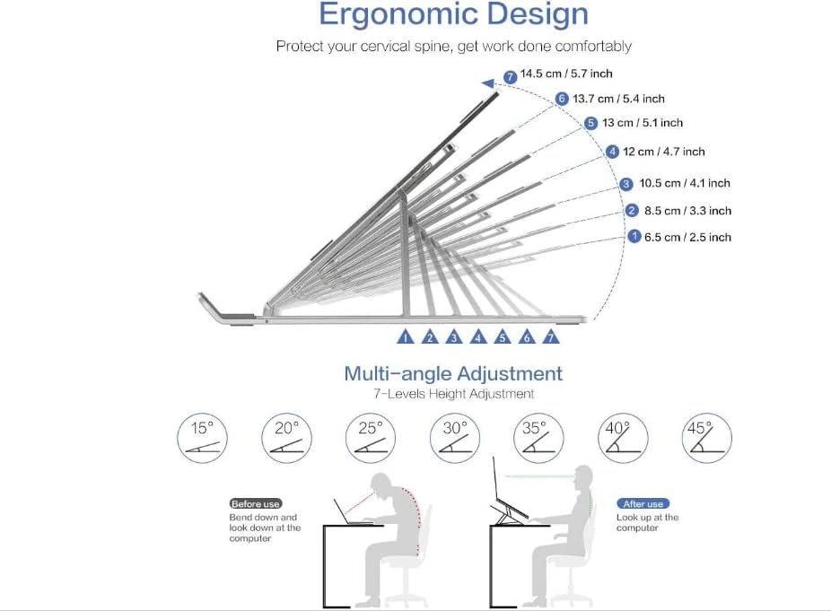 • المرونة: اضبط ارتفاع وإمالة حامل اللاب توب أو التابلت ليناسب احتياجاتك من خلال الإعدادات الستة المتاحة. كما أن تقليل الضغط على الرقبة والكتفين والظهر من المشاهدة والكتابة هو تأثير جانبي مرحب به للتصميم المريح.