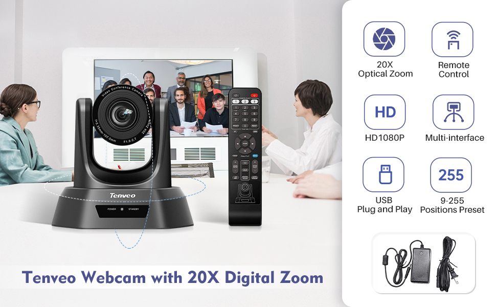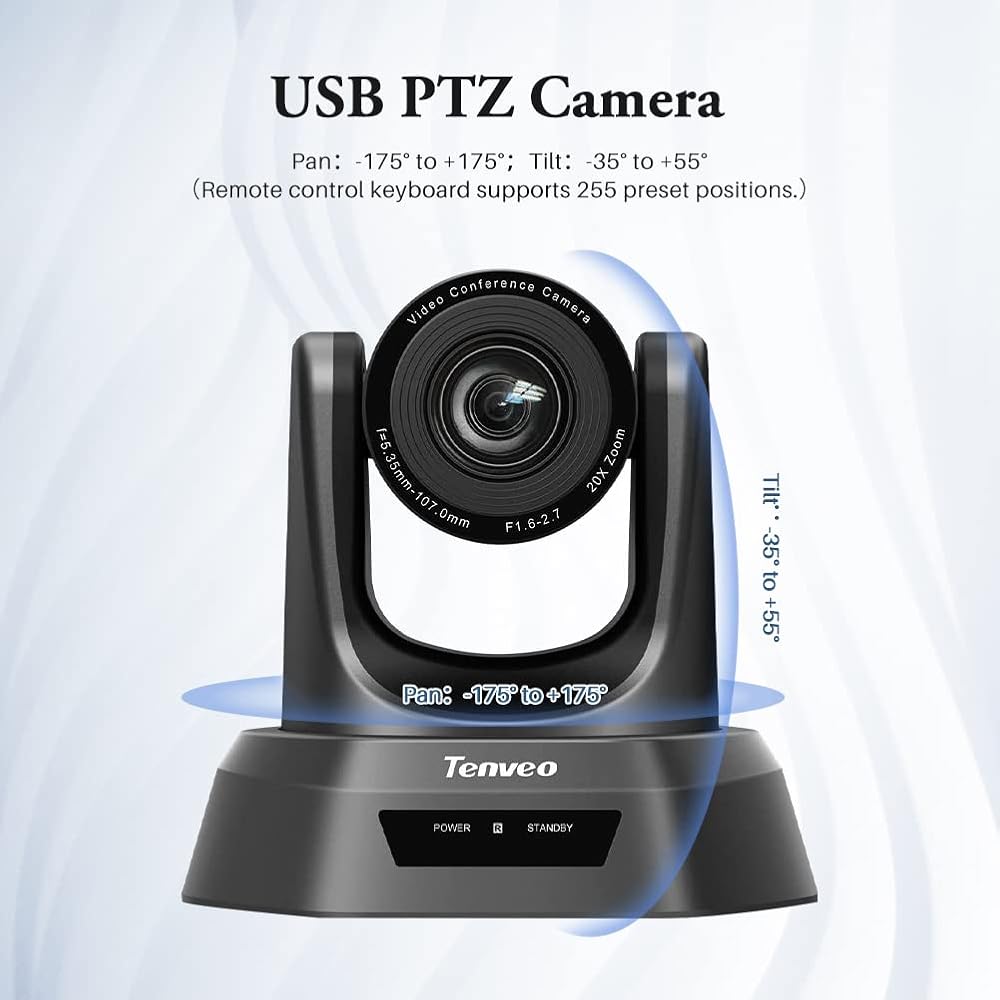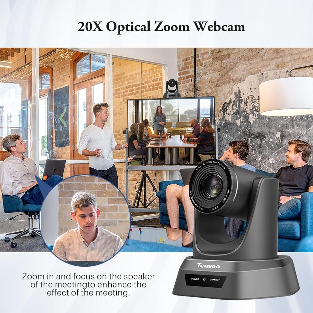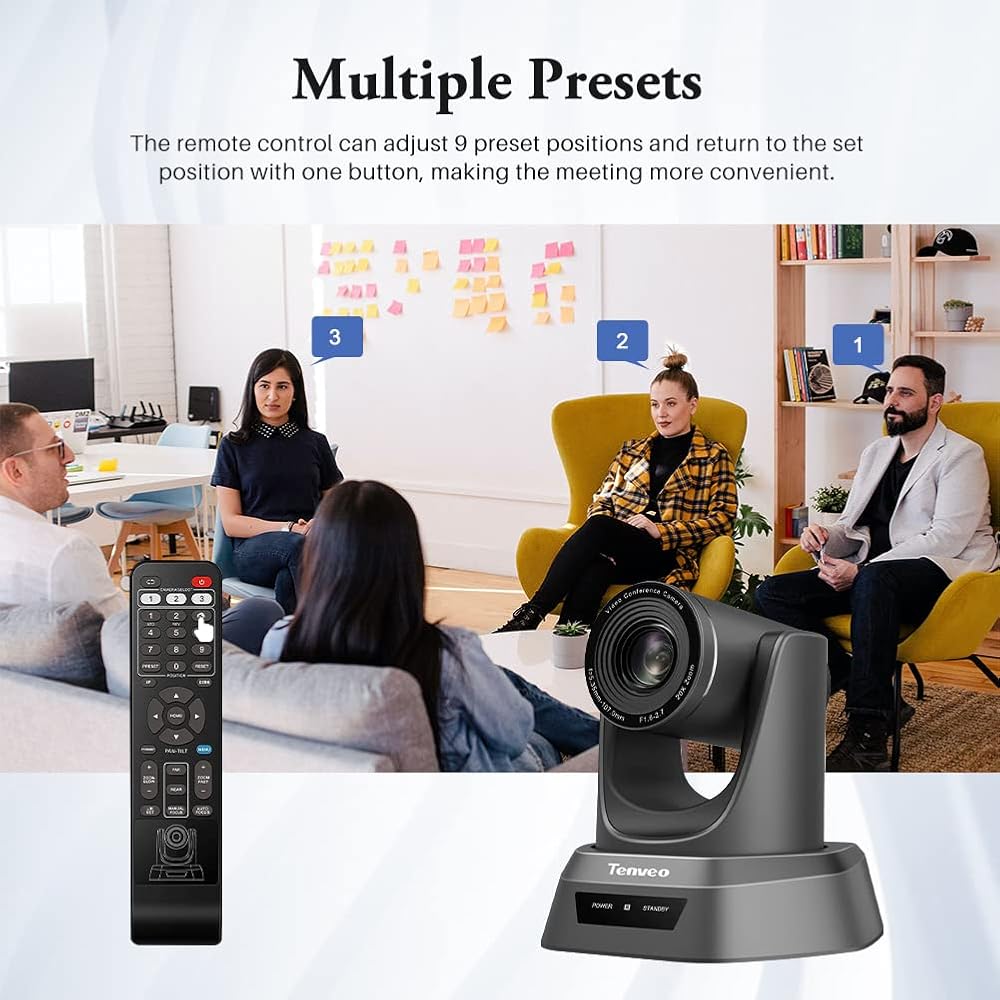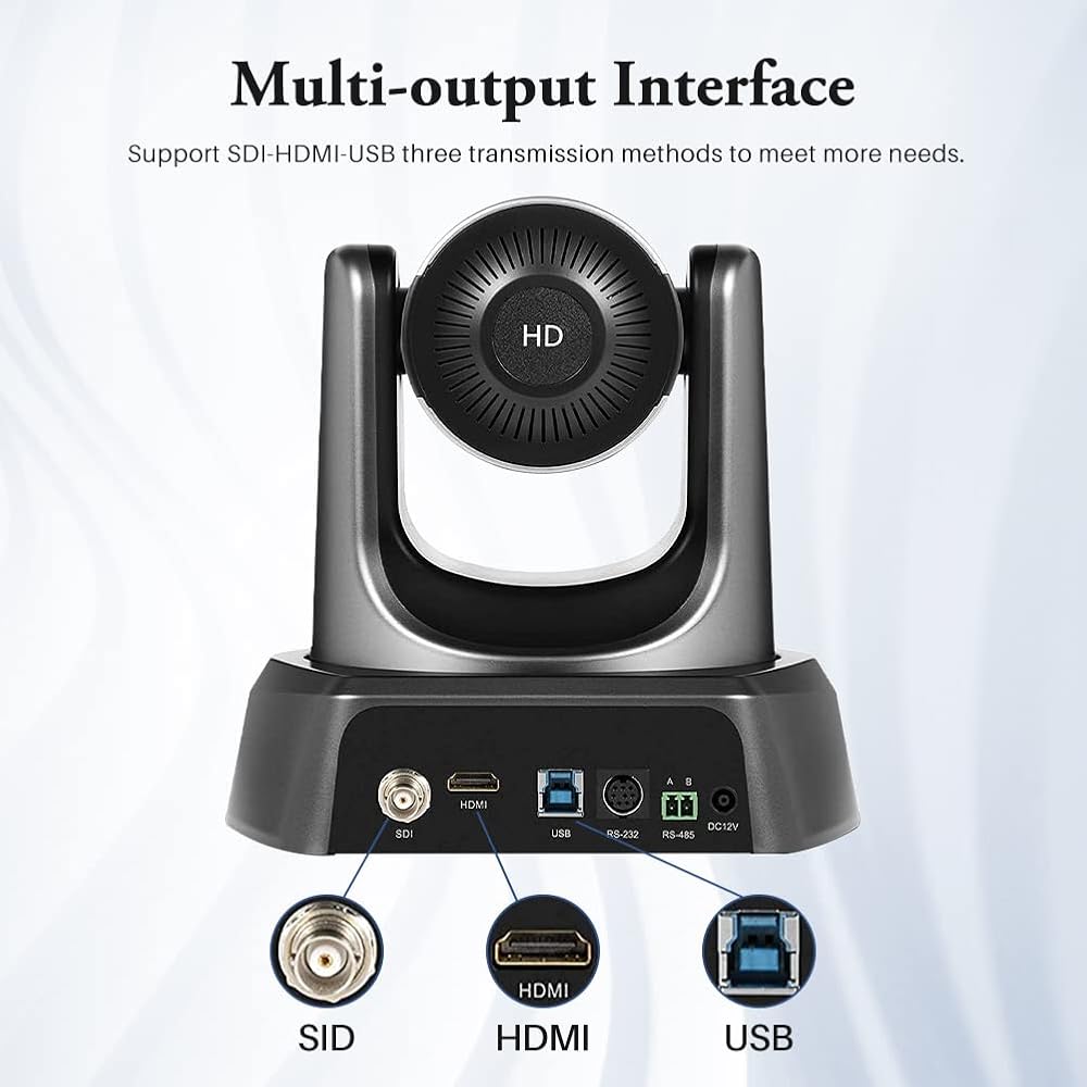 • كاميرا مؤتمرات احترافية بدقة 1080 بكسل عالية الدقة مع تقريب بصري 20x وواجهة USB وHD-SDI وHDMI لنقل فيديو عالي السرعة لغرف المؤتمرات التي تبلغ مساحتها 60 مترًا مربعًا، يمكن رؤية الجميع وسماعهم بوضوح.