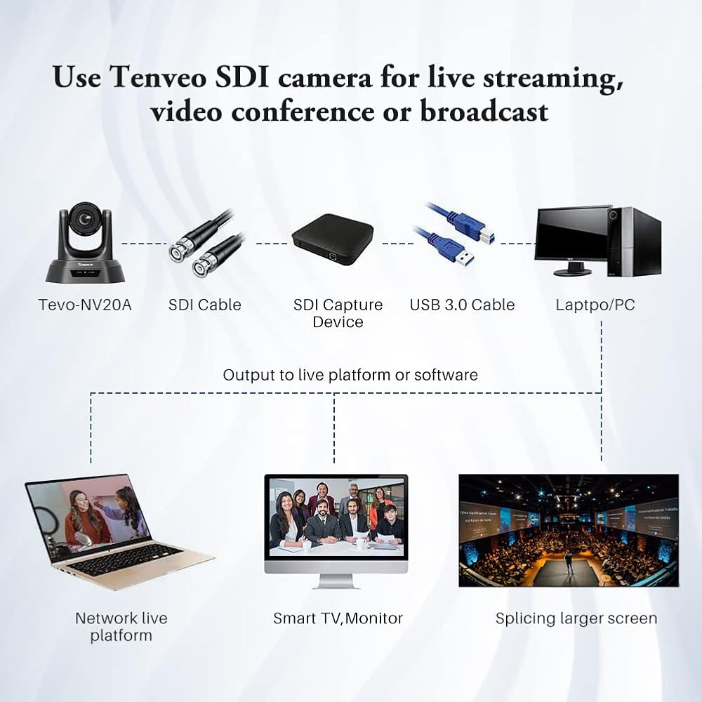 • تدعم واجهة HD SDI نقل الفيديو بطول 328 قدمًا. مناسبة للمشاهد الكبيرة، مثل غرفة الاجتماعات الكبيرة، والفصول الدراسية، والكنيسة. يرجى ملاحظة أن بطاقة الالتقاط (SDI HDMI/SDI USB) مطلوبة لإخراج إشارة SDI.