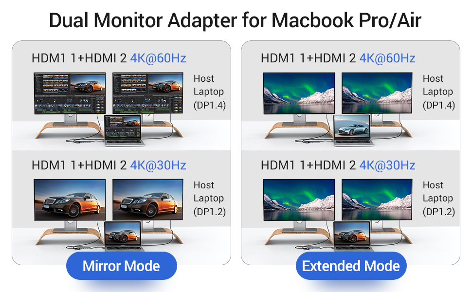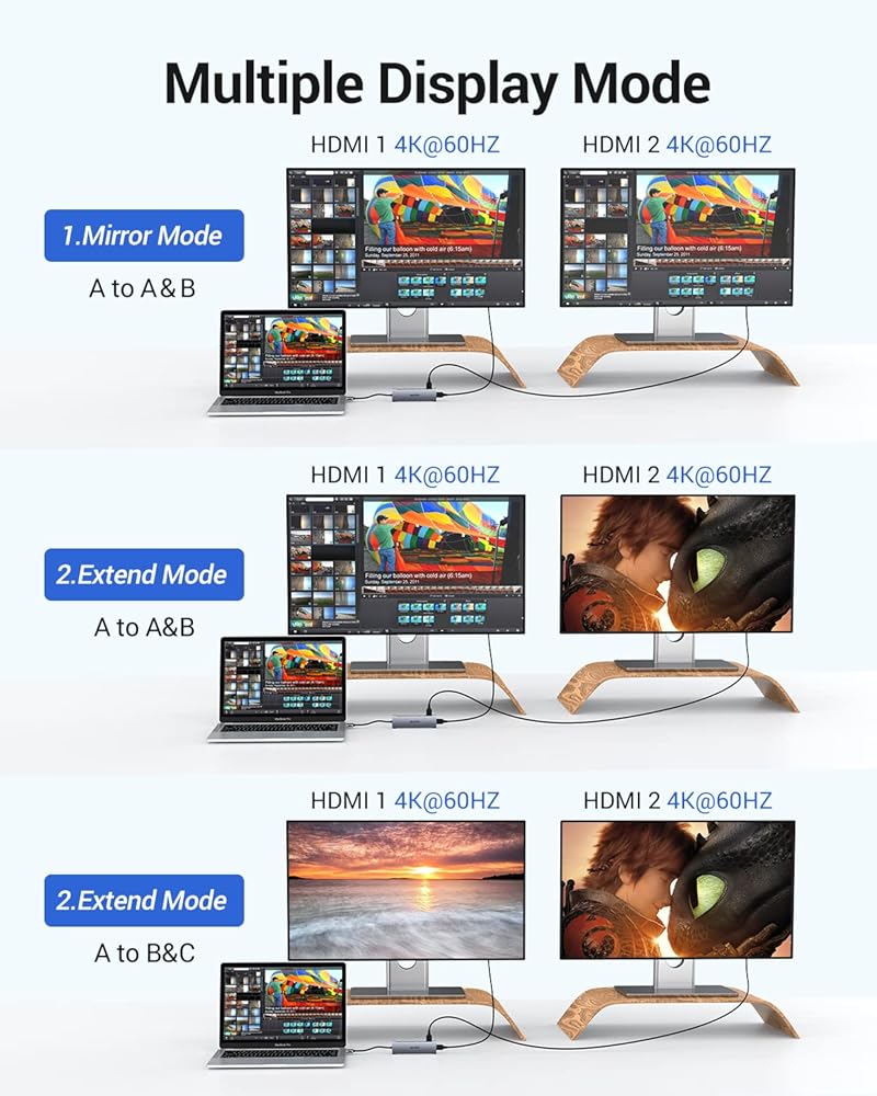 【فيديو مذهل بدقة 4K عبر HDMI مزدوج】تستخدم محطة إرساء الكمبيوتر المحمول USB C منفذ HDMI للدخول إلى وضع المرآة لنظام التشغيل Mac OS أو الوضع الممتد ونقل فيديو حيوي 4K Ultra HD عند 60 هرتز أو فيديو عالي الدقة 1080p @ 60 هرتز مع تأثير ثلاثي الأبعاد من شاشة الكمبيوتر المحمول إلى الشاشة. وجهاز العرض والتلفزيون عالي الدقة وما إلى ذلك. قم ببث الأفلام أو العروض التقديمية أو ألعاب الفيديو على شاشتك بنقرة واحدة: يمكن استخدام منفذي HDMI في وقت واحد.
