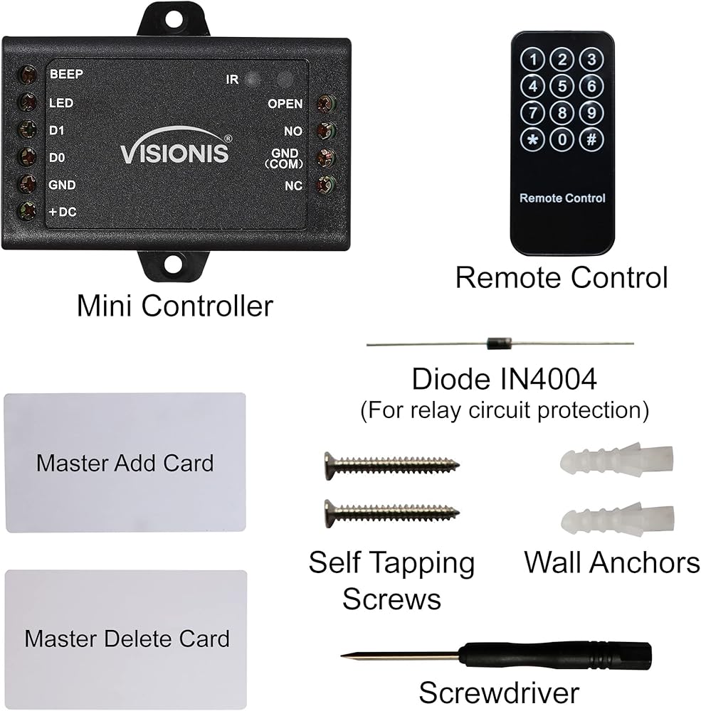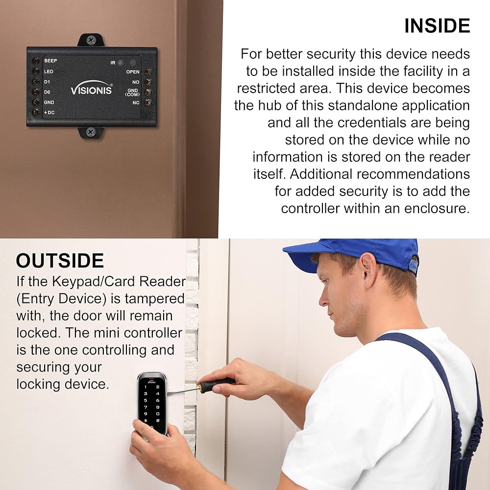 (1) VIS-3005 التحكم في الوصول داخليًا + خارجيًا، لوحة مفاتيح معدنية مضادة للتخريب بتصنيف IP68 + قارئ مستقل مع وحدة تحكم صغيرة + Wiegand 26، تصميم نحيف، بدون برامج، بطاقات EM، 1000 مستخدم، (1) VIS-MINI-CNTRL: باب واحد وحدة تحكم لأنظمة التحكم في الوصول بدون برامج. ما يصل إلى 1000 مستخدم