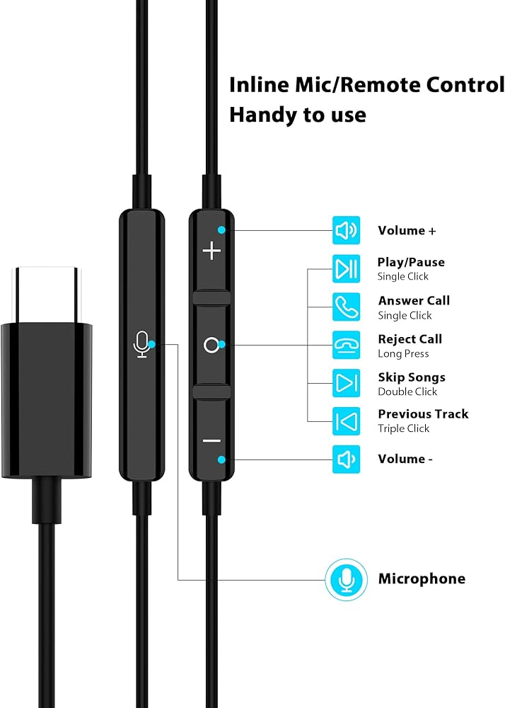 سماعات رأس من النوع سي مع ميكروفون: تتيح لك أزرار التحكم عن بعد تشغيل/ إيقاف الأغاني مؤقتًا، وتخطي الأغنية التالية/السابقة دون التقاط هاتفك. سهولة الوصول إلى التحكم في مستوى الصوت أثناء التنقل. الميكروفون المدمج مناسب لإجراء المكالمات بدون استخدام اليدين والرد على المكالمات ورفضها مباشرة باستخدام سماعات الأذن. ملاحظة: لا يمكن أن يدعم تعليق المكالمات؛ الميكروفون على الجانب الأيمن.