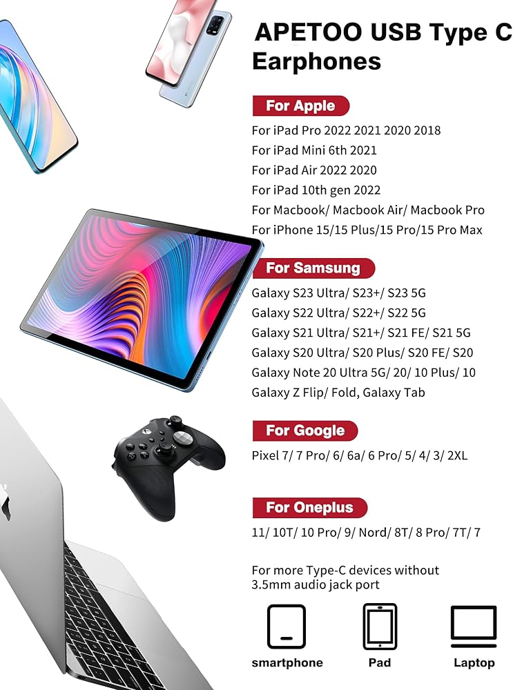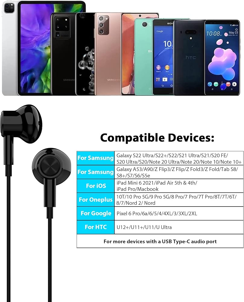 توافق واسع: تعمل سماعات الرأس من النوع سي مع سامسونج جالاكسي S22 الترا/S22+/ S22/ S21 الترا، S21 بلس، S21، S20 FE، S20، S20+، S20 الترا، نوت 20 الترا، نوت 20، نوت 10+، نوت 10، Z Flip4/3/2، Z Fold4/3/2 , , , A53, , A60، A80؛ جوجل بكسل 7، 7 برو، 6 برو، 6a، 6، 5، 4، 4XL، 3، 3XL، ون بلس 10T، 10 برو، نورد 2، 9 برو، 9، نورد، 8 تي، 8 برو، 8، 7 تي برو، 7 تي، 7 برو، ايباد ميني 6 2021، ايباد برو، ايباد اير الجيل الرابع والخامس، وأكثر من ذلك أجهزة usb-c بدون منفذ صوت 3.5 ملم