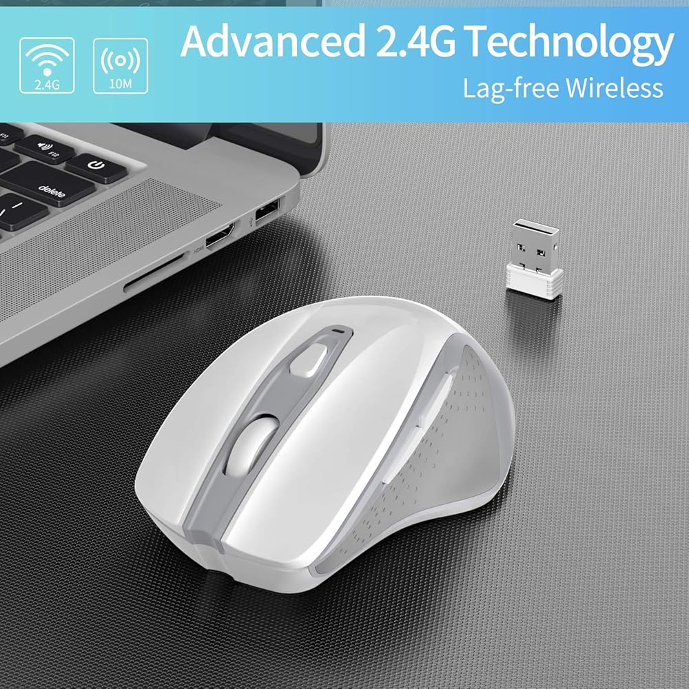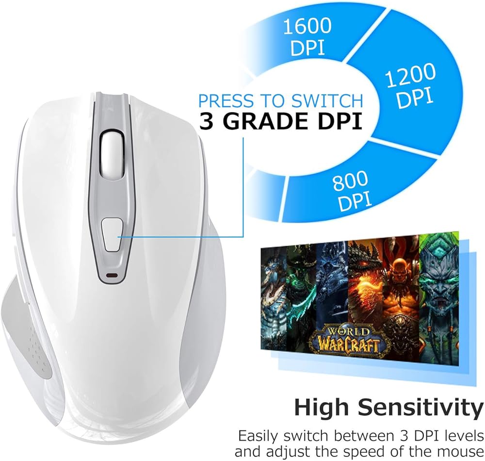👍التوصيل والتشغيل - يتم فتح جهاز الاستقبال اللاسلكي الصغير بسهولة في منفذ USB بجهاز الكمبيوتر الخاص بك، وضبط DPI (1600/1200/800) بواسطة زر DPI، والتحكم في سرعة الحركة الخاصة بك بحرية ومريحة، مع شغل أقل مساحة.
