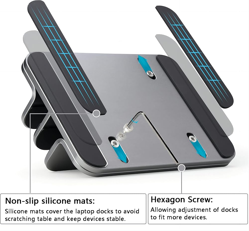• حصيرة واقية: تغطي سجادات السيليكون غير السامة وغير القابلة للانزلاق فتحات اللاب توب لتجنب الخدوش على أجهزتك؛ وسائد سيليكون غير قابلة للانزلاق على القاعدة تضمن الثبات والأمان.