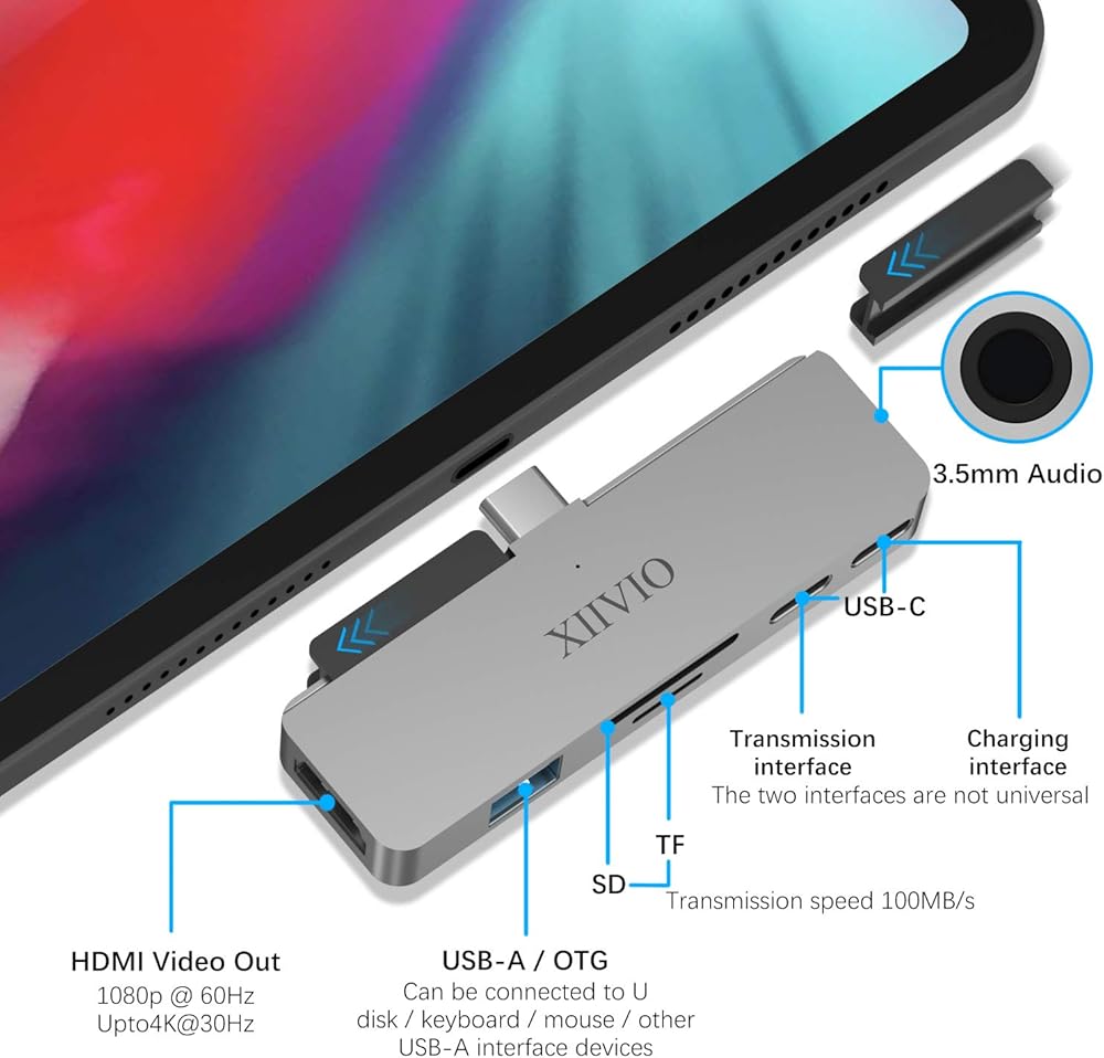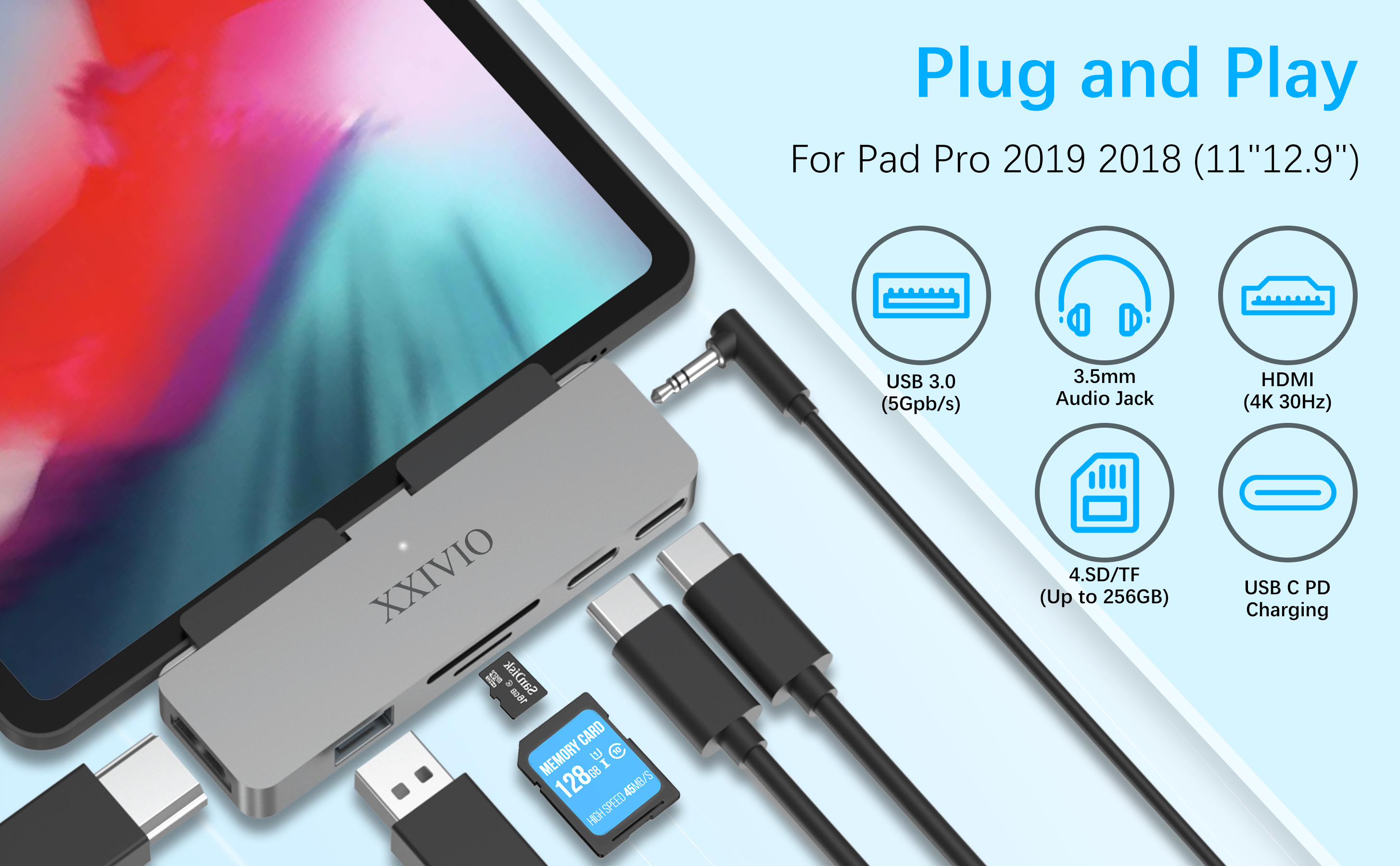 موزع USB C لايباد برو 2019 2018، محول زدفيو 7 في 1 USB نوع C الى 4K HDMI مع USB 3.0، شحن USB-C PD وقارئ بطاقات SD/TF، مقبس سماعة راس 3.5 ملم متوافق مع ايباد برو الجديد 2019 2018 11/12.9 انش