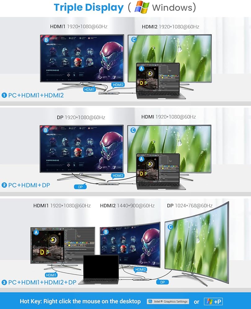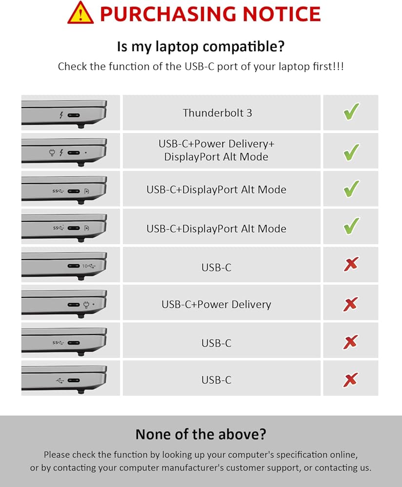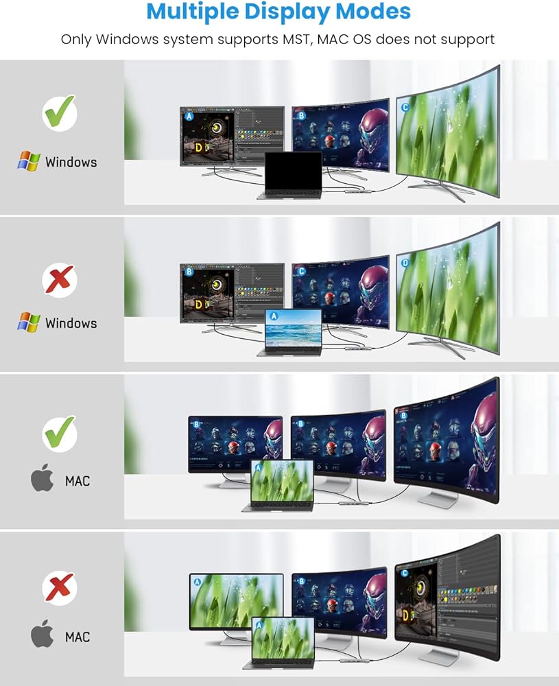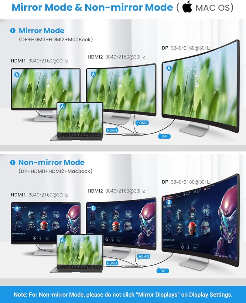 قاعدة توصيل إخراج فيديو كريستال 4K 3 شاشات: بمساعدة قاعدة شحن كيوو MacBook ، يمكنك توصيل 3 شاشات خارجية في وقت واحد. مع أقصى دقة تصل إلى 3840 × 2160 عند 30 هرتز. يرجى ملاحظة أنه عندما يتمدد اللاب توب الذي يعمل بنظام ويندوز إلى 3 شاشات خارجية، ستكون شاشة اللاب توب فارغة. لمزيد من إعدادات ودقة العرض، يرجى الرجوع إلى وصف المنتج.