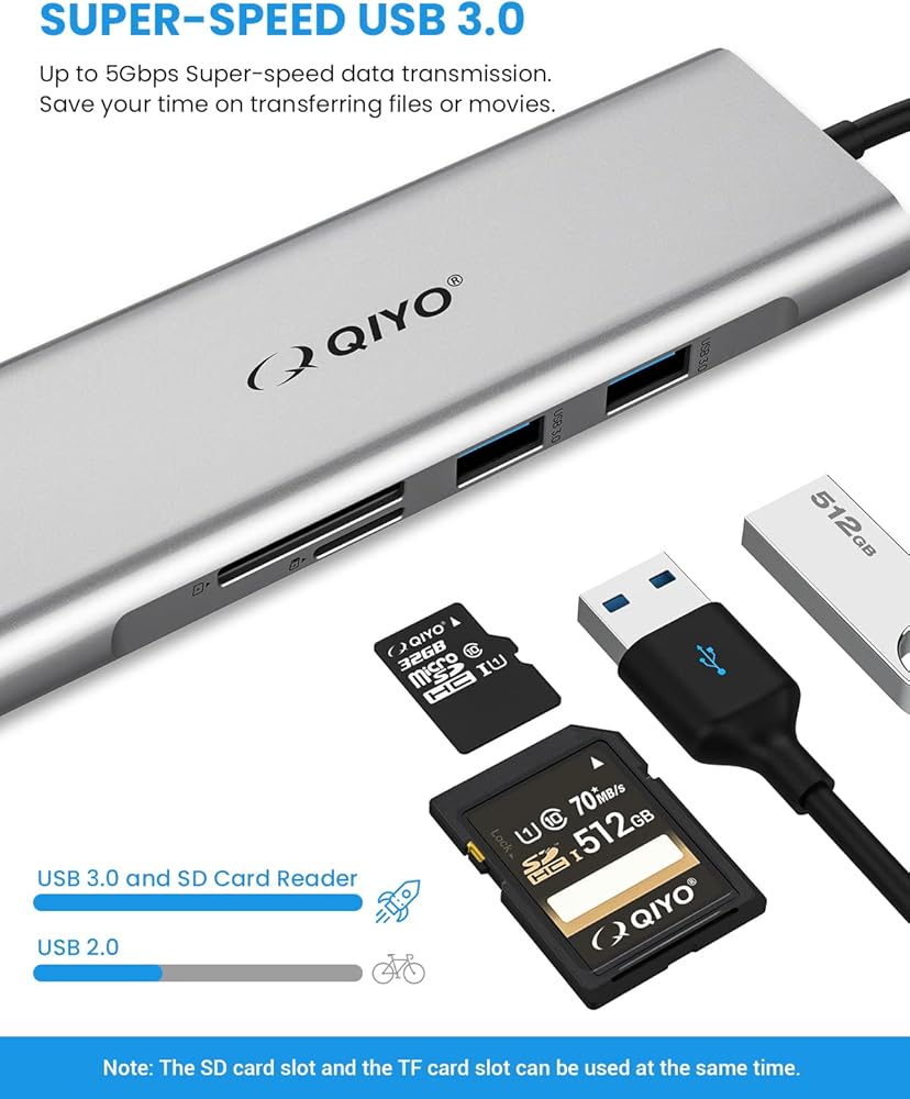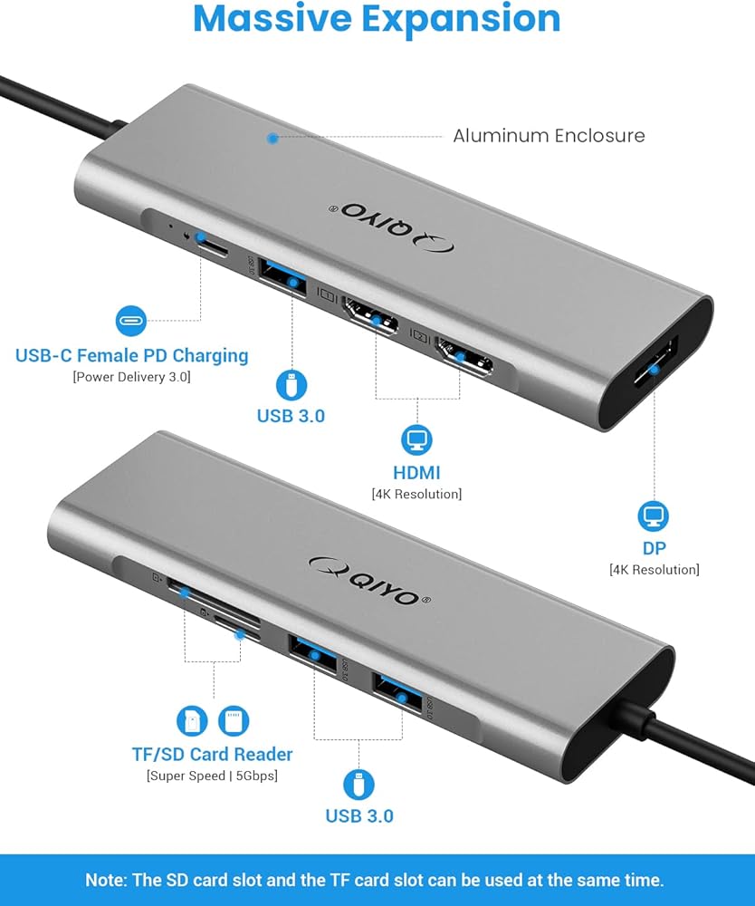 قاعدة شحن USB C شاشة مزدوجة: تحتوي قاعدة شحن ماك بوك برو 9 في 1 من كيوو على منفذي HDMI مدمجين ومنفذ عرض واحد، بالإضافة إلى منافذ USB 3.0 العادية، ومنفذ شحن PD بالإضافة إلى فتحات بطاقة SD/TF. إنه ببساطة موزع USB نوع سي للتوصيل والتشغيل دون الحاجة إلى تثبيت أي برنامج تعريف أو برنامج إضافي لجعله عمليًا.