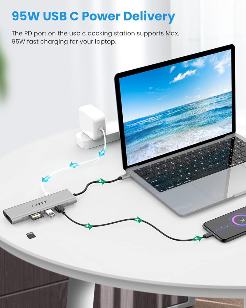شحن سريع 95 واط لجهاز اللاب توب الخاص بك: مع منفذ USB-C PD على قاعدة شحن كيوو ، يمكنك الحصول على طاقة 95 واط كحد أقصى لشحن اللاب توب الخاص بك أثناء العمل. من المهم بشكل خاص توصيل كابل الطاقة الخاص باللاب توب الخاص بك أثناء توصيل جهاز عالي الاستهلاك للطاقة مثل ذاكرة الفلاش أو القرص الصلب أو الطابعة وما إلى ذلك. يرجى ملاحظة أن منفذ توصيل الطاقة (PD) هذا لا يحتوي على وظيفة نقل البيانات.