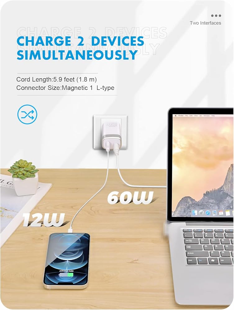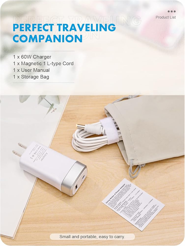 [شاحن صغير] - يوفر شاحن Mac book pro 60 وات مع ضوء LED حالة الشحن، وهو مصمم ليكون الرفيق المثالي للسفر. الحجم الصغير للغاية والجسم المدبب الأنيق يجعل من هذا المنتج جوهرة جيب ويسهل حملها أثناء السفر.